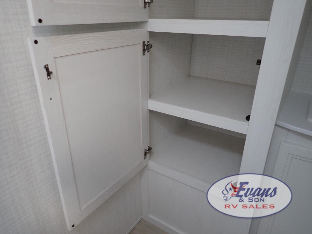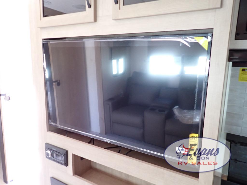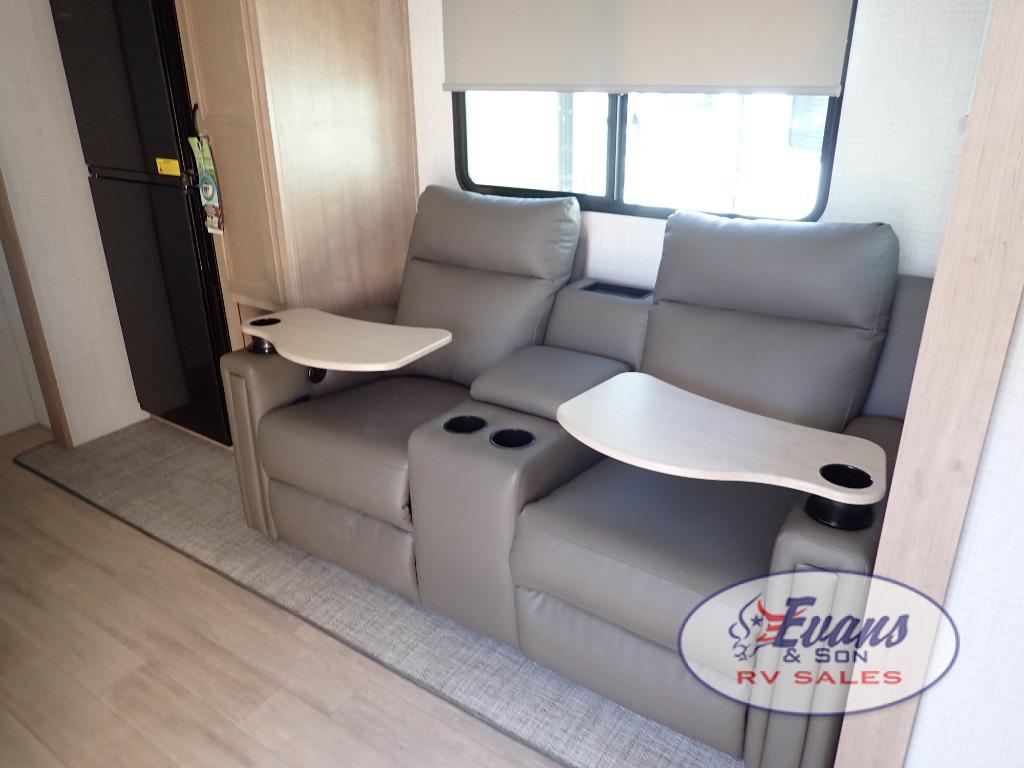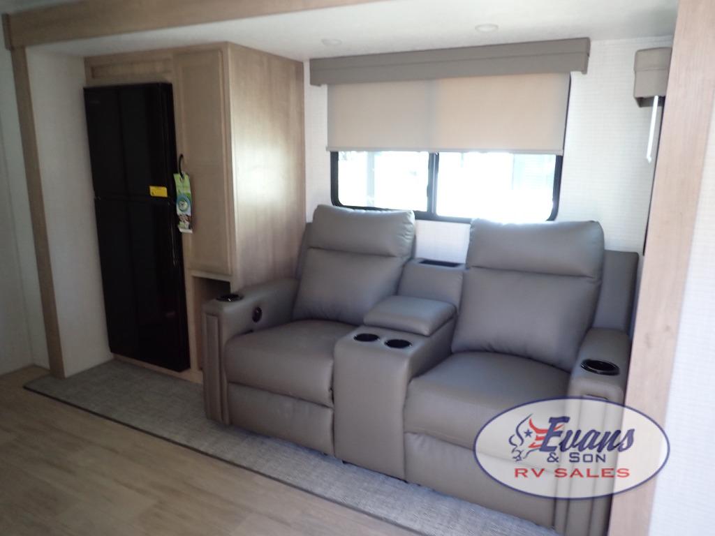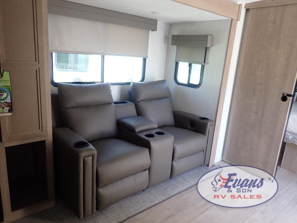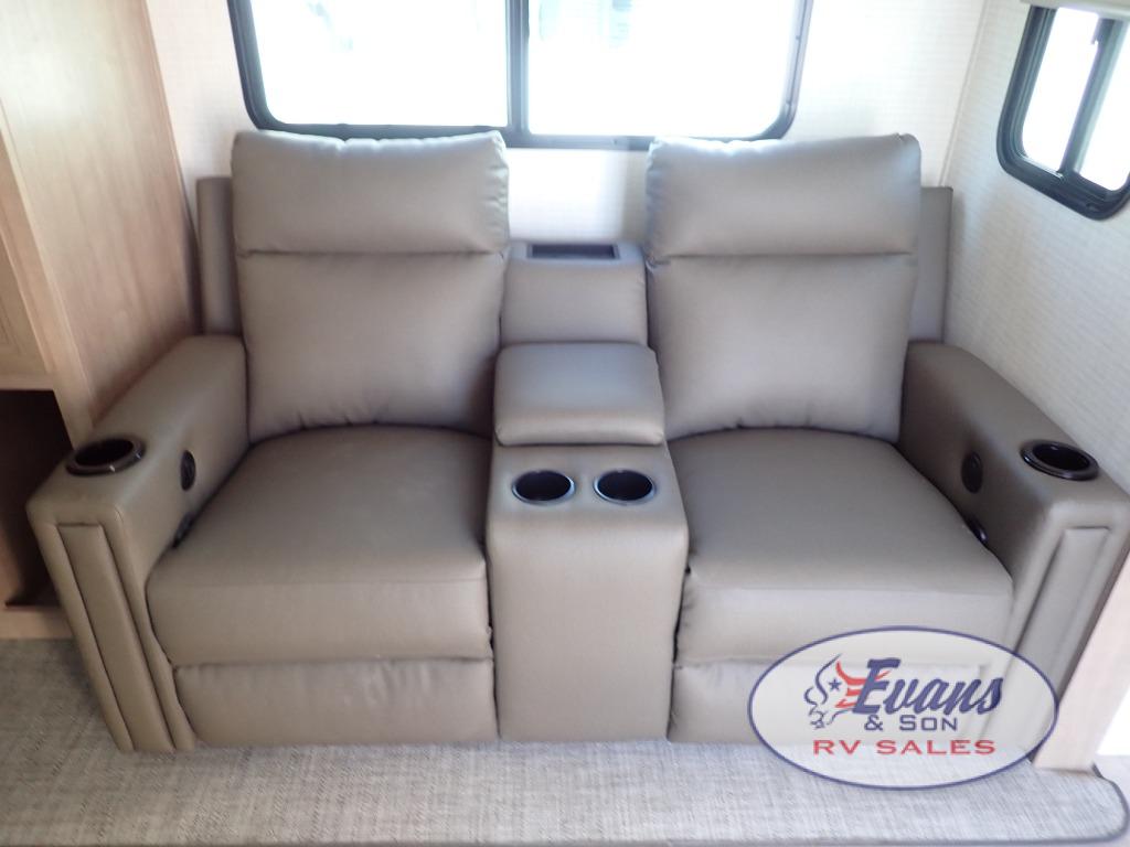 This couple's trailer includes an exterior pull-out stove with an exterior refrigerator the chef if sure to love. And the full kitchen amenities inside include a glass top flush mount range, a microwave, an 11 cu. ft. refrigerator and a pantry. You can relax inside on the theater seats that are within a large slide out while watching the entertainment center, and the entry closet is super handy. The full rear bathroom gives you the space you need as well as a shower with a seat. And the front bedroom provides a queen bed, dual wardrobes and privacy.
