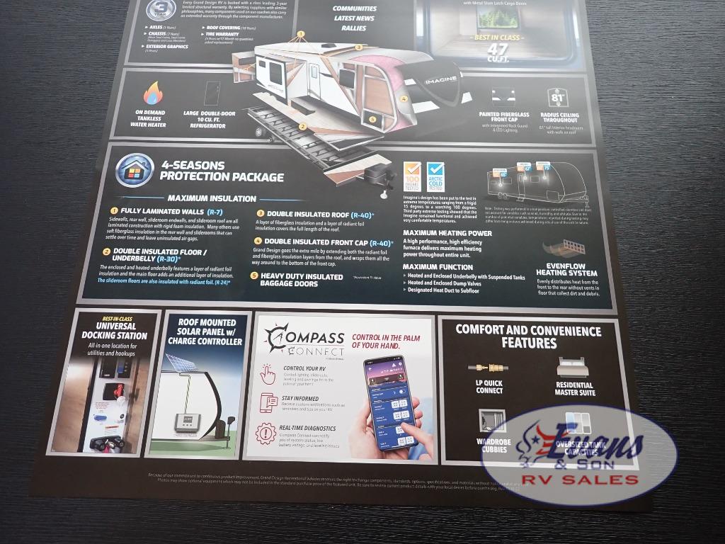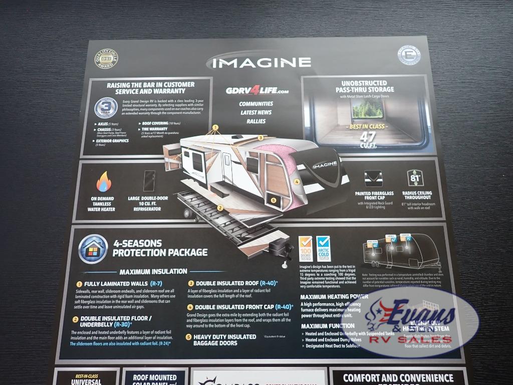 Just imagine leaving the world behind and secluding yourself away with your favorite people in your Grand Design Imagine travel trailer! The Imagine has been designed to enjoy extended season camping and includes a high-capacity furnace, a heated and enclosed underbelly with suspended tanks, a designated heat duct to the subfloor, and a high-density roof insulation with attic vent. You'll have maximum head room on the interior with 81" radius ceilings, and large panoramic windows to let in natural lighting. The exclusive drop-frame pass-through storage compartment is going to allow you to bring along lots of equipment, and the universal docking station is an all-in-one location for utilities and hook-ups. You'll also have industry-leading tank capacities so that you can fill and empty your tanks less often.