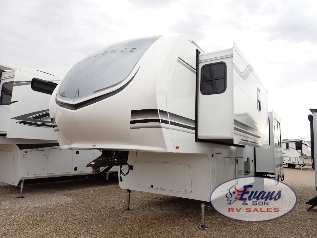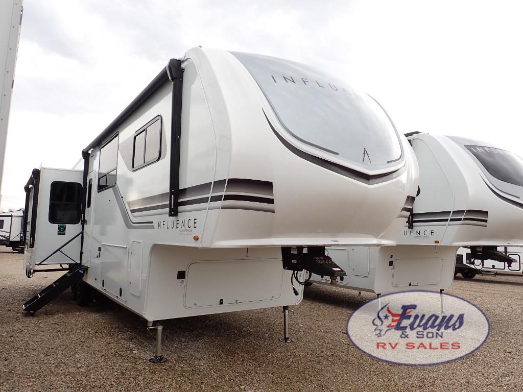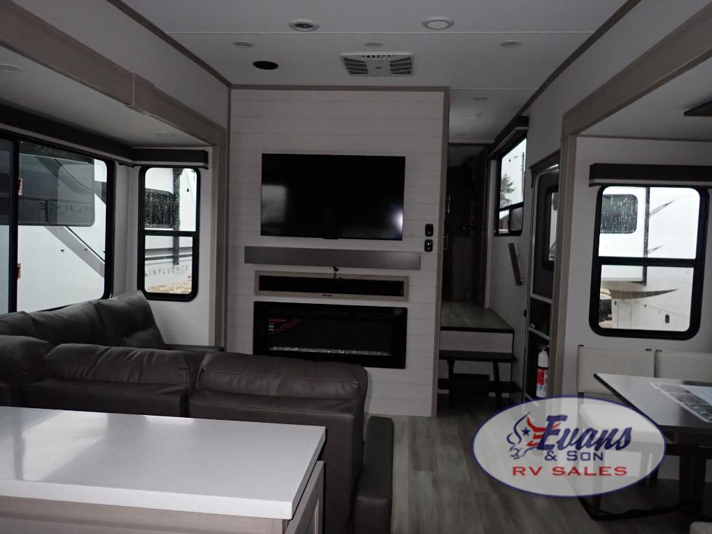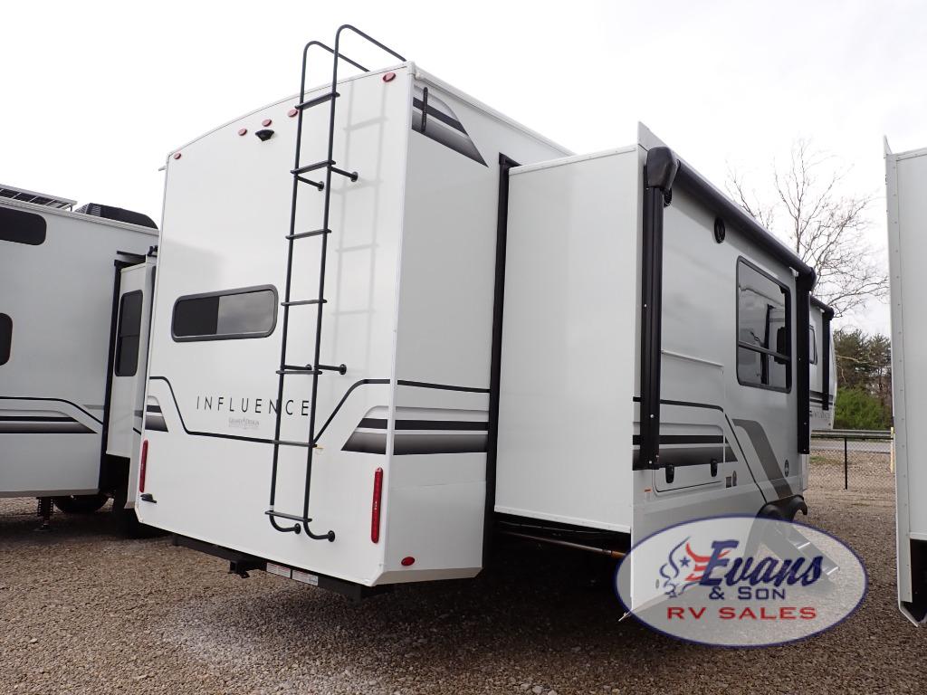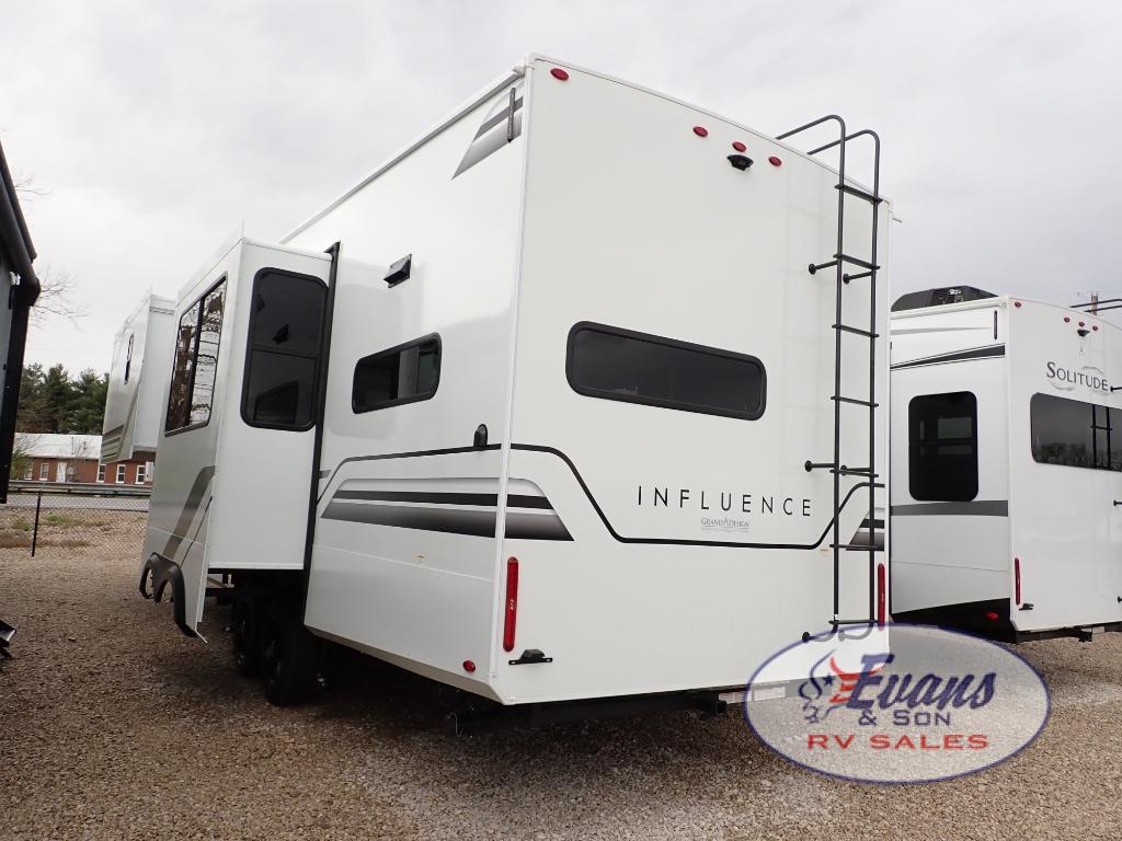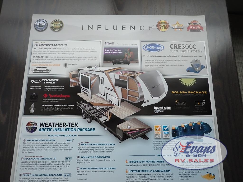 Any Grand Design Influence fifth wheel features five-sided aluminum cage construction with a walk-on roof and a fully enclosed underbelly with heated tanks and storage for all weather camping. For peace of mind, the MORryde CRE3000 Suspension system will provide safe and smooth towing, and the 101" widebody construction offers all the room you need and that is before multiple slides are fully engaged. You will appreciate the Keyed-Alike locks, slam-latch baggage doors with magnetic door catches, exterior security light, and SolidStep entry steps. On the inside, Congoleum flooring, premium roller shades for privacy, a hallway handrail for safety, and nightstands with USB ports to keep all of your electronics fully charged. You will also love the On Demand tankless water heater when showering, plus the added heat and ambiance from an electric fireplace, and so much more!