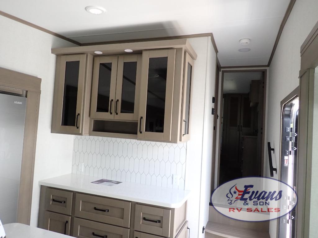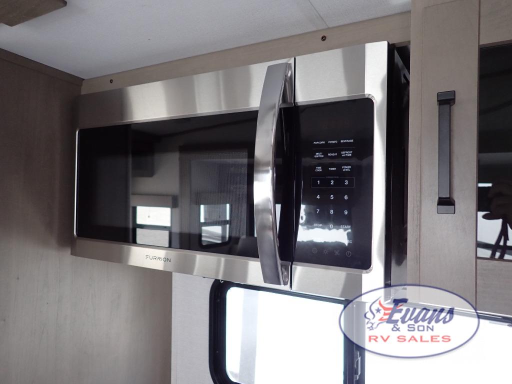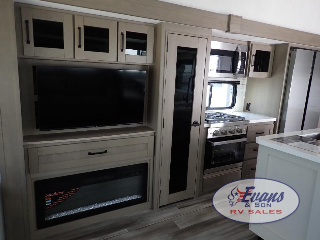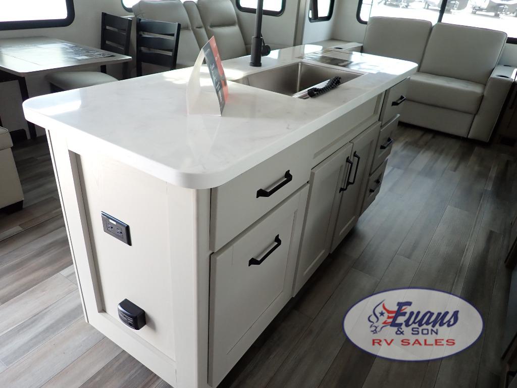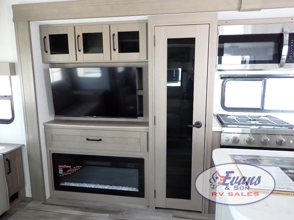 You can enjoy a spacious rear living area in this RV with dual opposing slides offering you entertainment, kitchen amenities, seating and windows for great views! The rear tri-fold sofa also converts into extra sleeping space for an extra guest or two, just like the booth dinette does. Yet you might like to add the free standing dinette option. There are theater seats to enjoy while you place your drinks in the cupholders and watch the entertainment center with a 40" LED HDTV and fireplace. The pantry is big enough to store your favorite snacks, and the kitchen island will make meal prepping easier, plus there is a 16 cu. ft. refrigerator to store any leftovers. The full bathroom has a 30" x 48" fiberglass shower and a linen closet to store your towels. The front private bedroom has a comfortable queen bed slide that can be switched out for the optional king bed, a dresser with overhead cabinets, and a full wall wardrobe that is prepped to add the optional washer and dryer so that you can extend your camping trip with clean clothes!