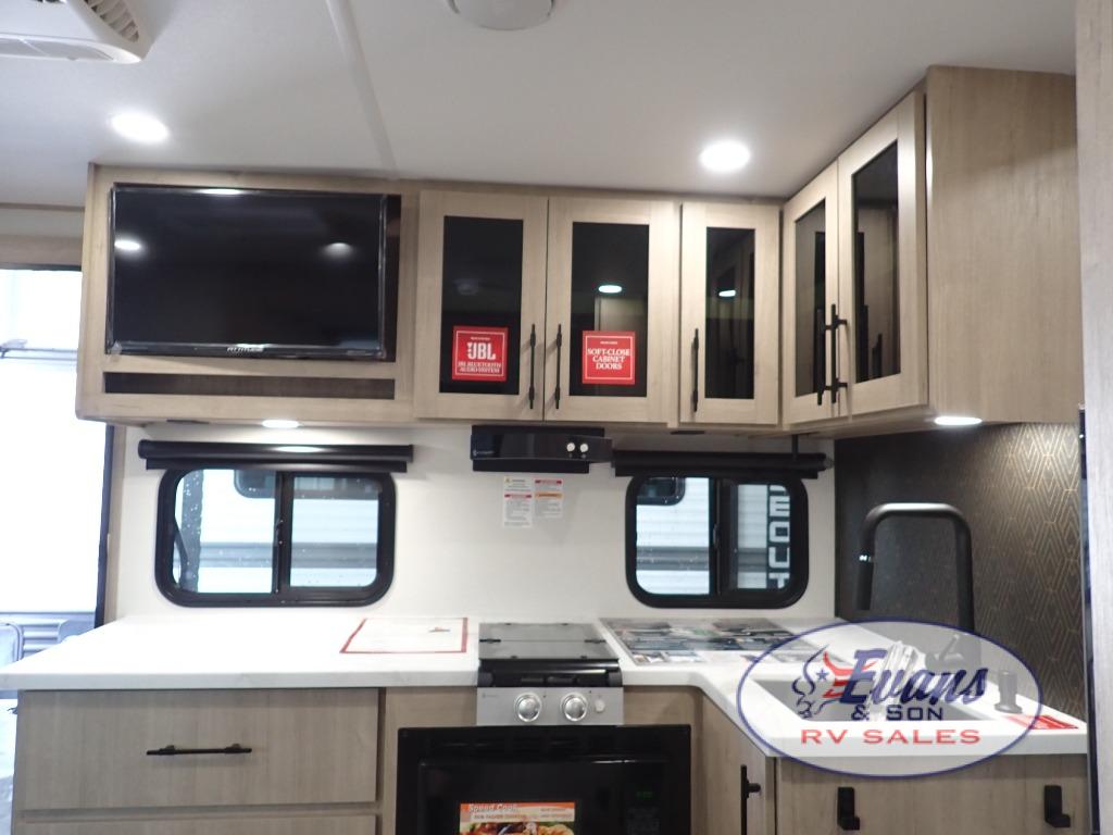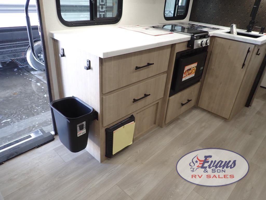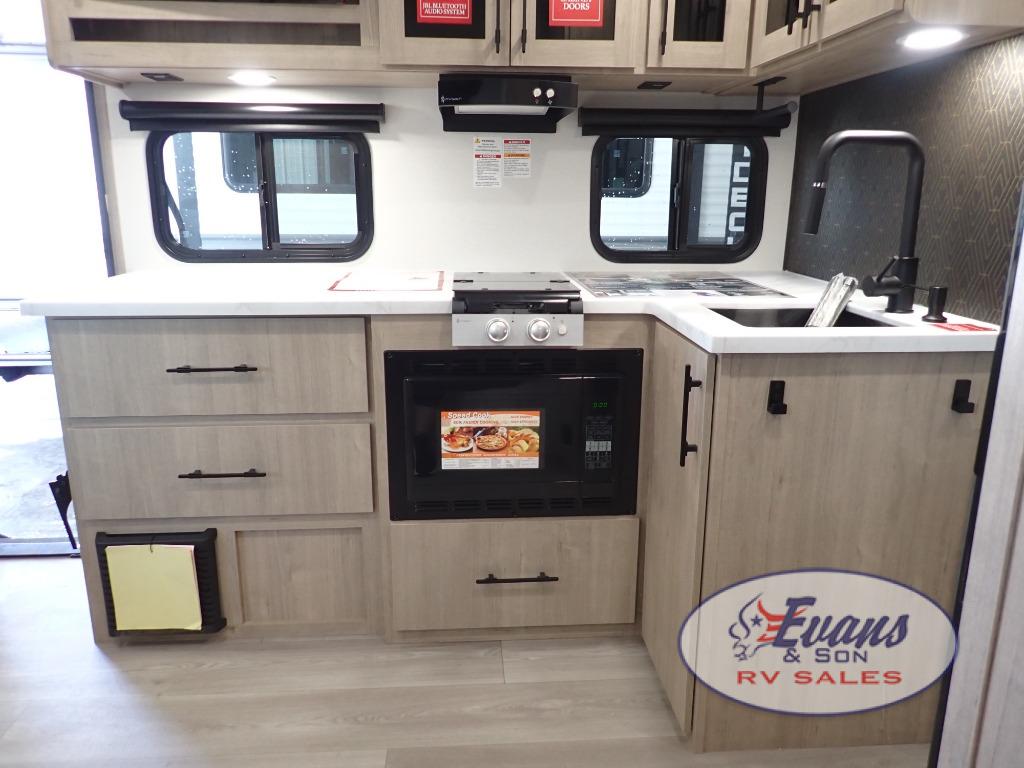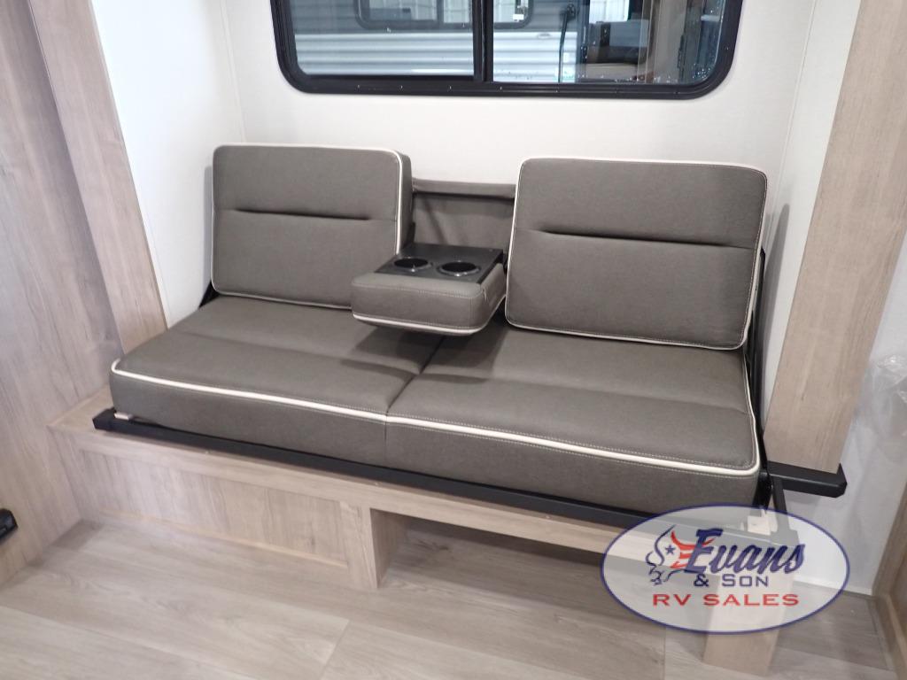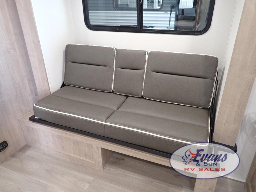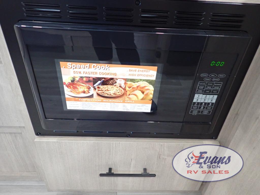 Pack your bags and head out on a fun camping trip in this travel trailer! The front queen bed offers a comfortable place to sleep at night, as well as the roll-over sleeper sofa slide with drawers for storage. You can make meals on the cooktop or in the convection microwave. The full rear bathroom has a walk-in shower with an oversized vanity to easily get ready each day. Outside, you'll find a spray port, an unobstructed pass-thru storage, and an interior/exterior table to use at your convenience.