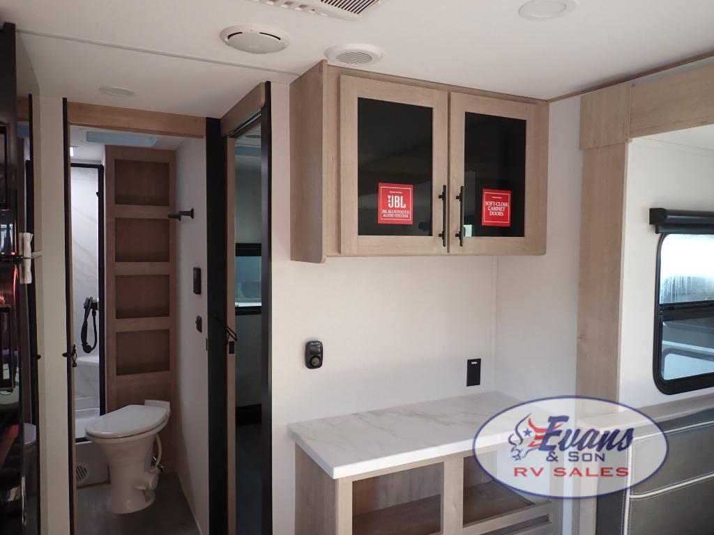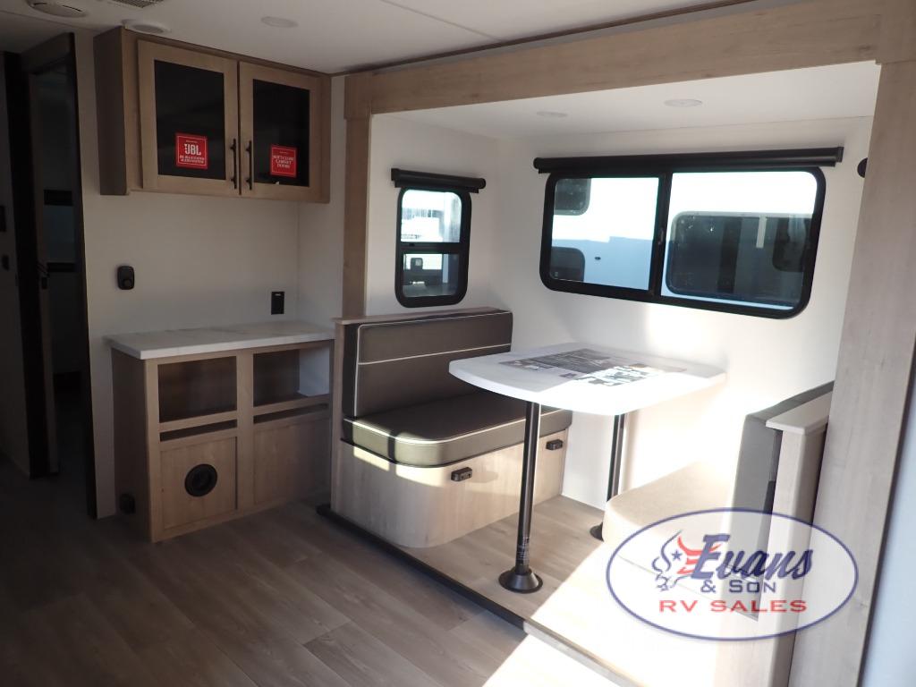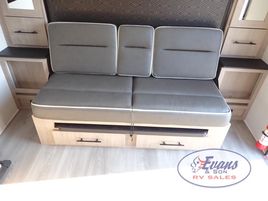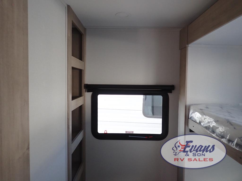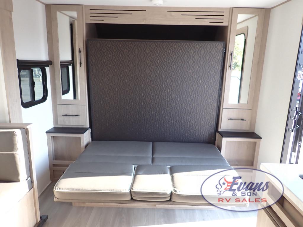 Your family will love camping in this spacious and versatile trailer thanks to the double slides and Murphy bed provided. During the day the Murphy bed is tucked away to provide more space and seating, and at night when folded down, there is a curtain for some privacy as you sleep. The booth dinette slides out to provide even more space and features windows on three sides so you can look out at your surroundings while you enjoy breakfast. The 30" flip top and bottom bunks each have some privacy with the sliding door, and the bunks are right next to the full bathroom for easy access in the middle of the night. The kitchen features everything you need to create meals and snacks as you travel, and you can have some more prep space by using the flip-up countertop extension.