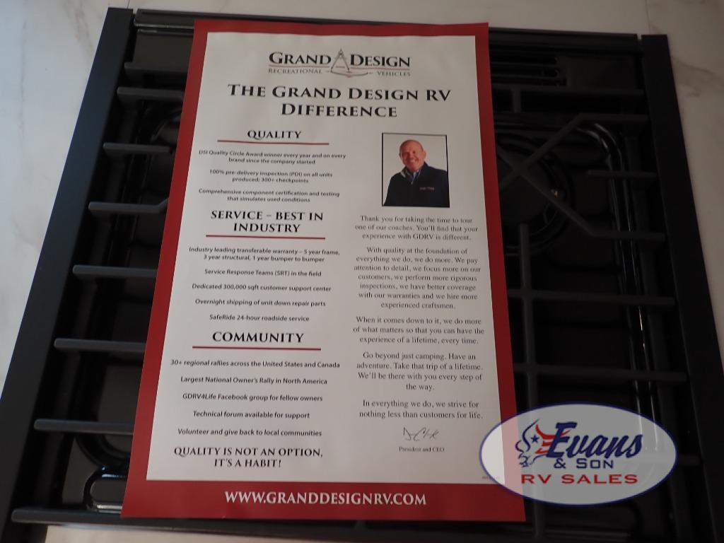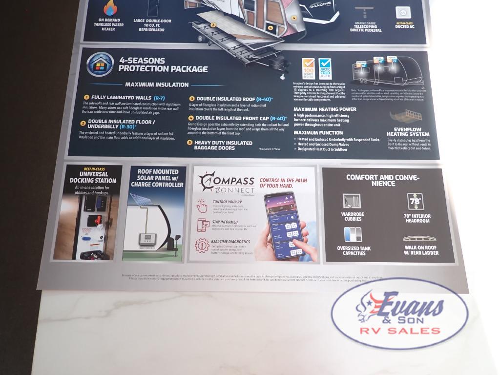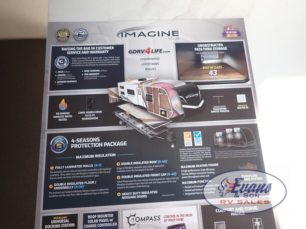 Let your imagination run wild with the possibilities that the Grand Design Imagine XLS travel trailer can provide! The Imagine XLS has been built with oversized tank capacities, an extra-large 2" fresh water drain valve, a ducted A/C system, a power tongue jack, and a heated and enclosed underbelly with suspended tanks. There is a designated heat duct to the subfloor and a residential ductless heating system throughout. For outdoor adventures, the electric awning with LED lights will enable you to stay protected, and the Tuff-Ply pass-thru flooring will withstand your many adventures. You will also love the XLS Solar Package that comes with a 180W roof mounted solar panel, a 40 Amp charge controller, a 12V 10 cu. ft. refrigerator, and roof mounted quick connect plugs!