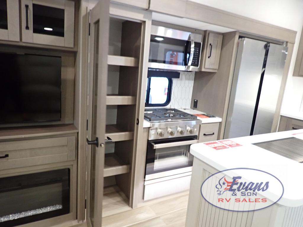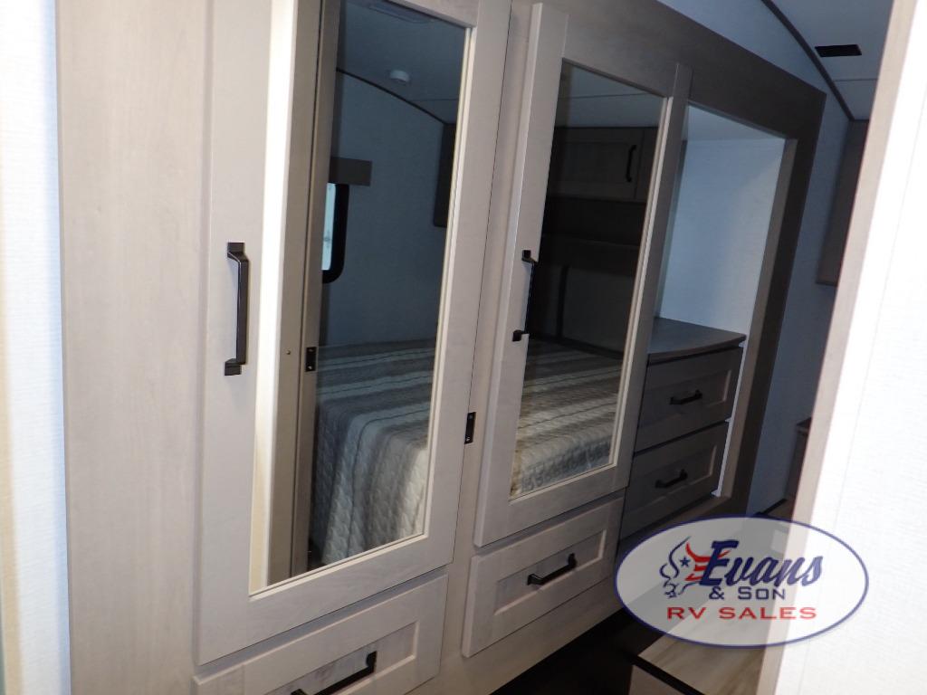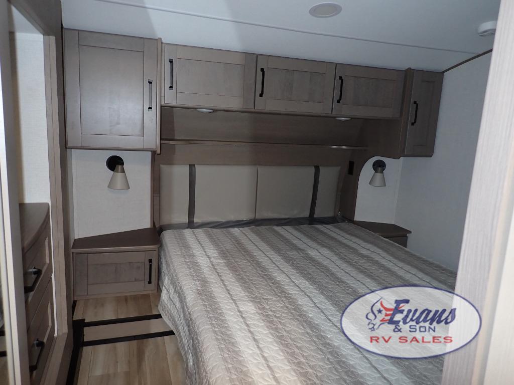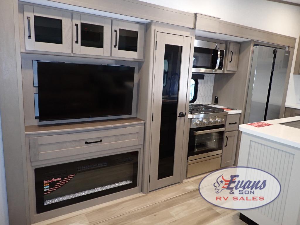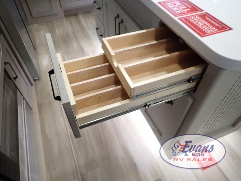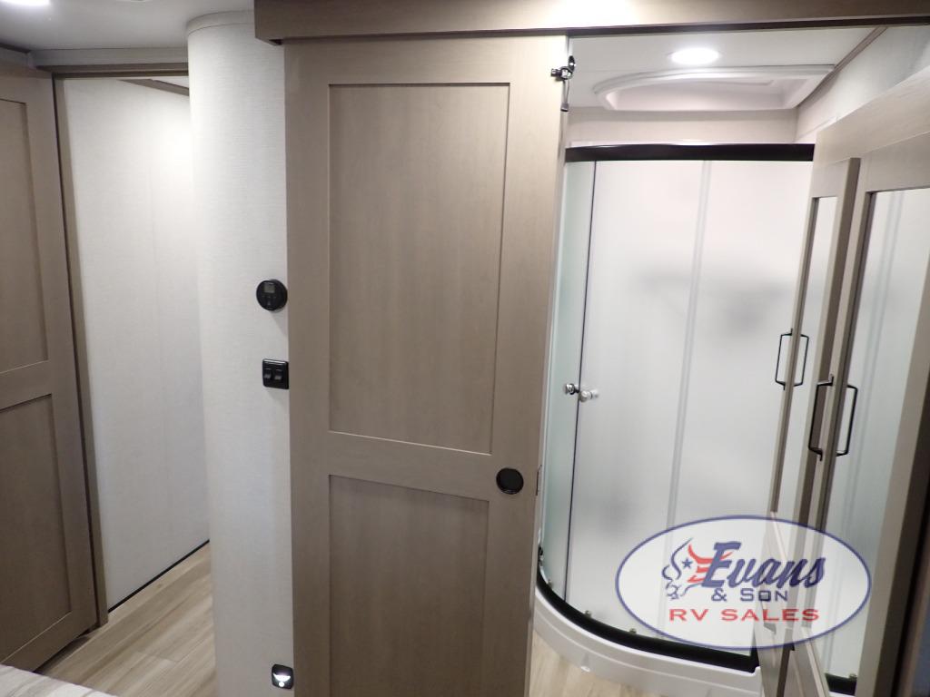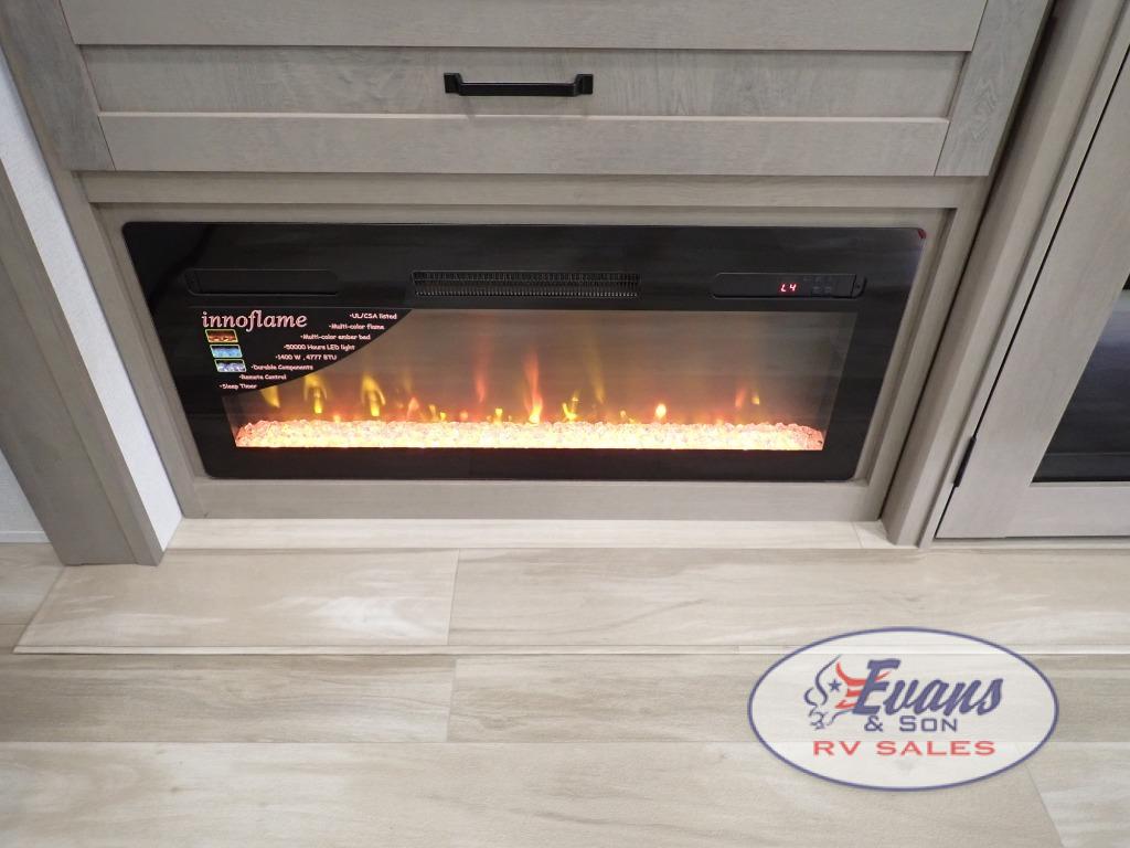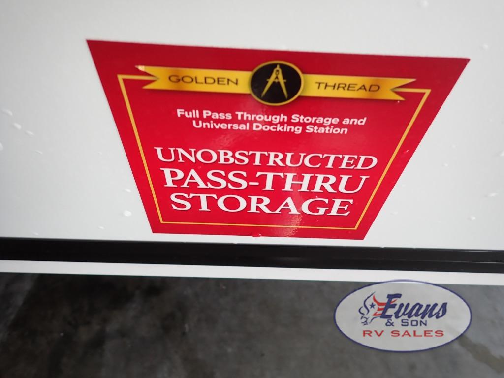Whether you travel for pleasure or work, you will love the spacious main living and kitchen area with a rear tri-fold sofa that doubles as extra sleeping space, and the theater seating directly across from the entertainment center with a 40" LED HDTV and a fireplace below. The kitchen island will make meal prepping and drying the dishes easier and the hutch is the perfect place to place your picture frames, nice dishes, and extra cooking items. There is even a pantry that is big enough to store all of your favorite snacks, dry ingredients and such. Outside you can enjoy two electric awnings that provide protection from the elements as you relax and visit with other RVers, and your camping chairs can easily be stored in the pass-through compartment. The double entry bathroom is convenient especially at night when you can slide the door to enter from the front master bedroom. You will find plenty of storage for your clothing and gear, plus the bedroom slide out gives you drawers and linen storage that stretches into the full bathroom.