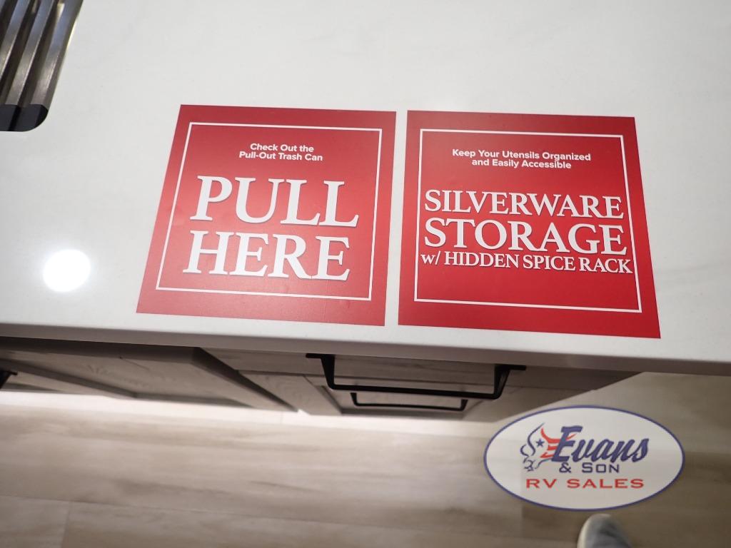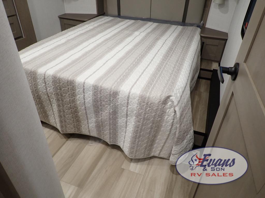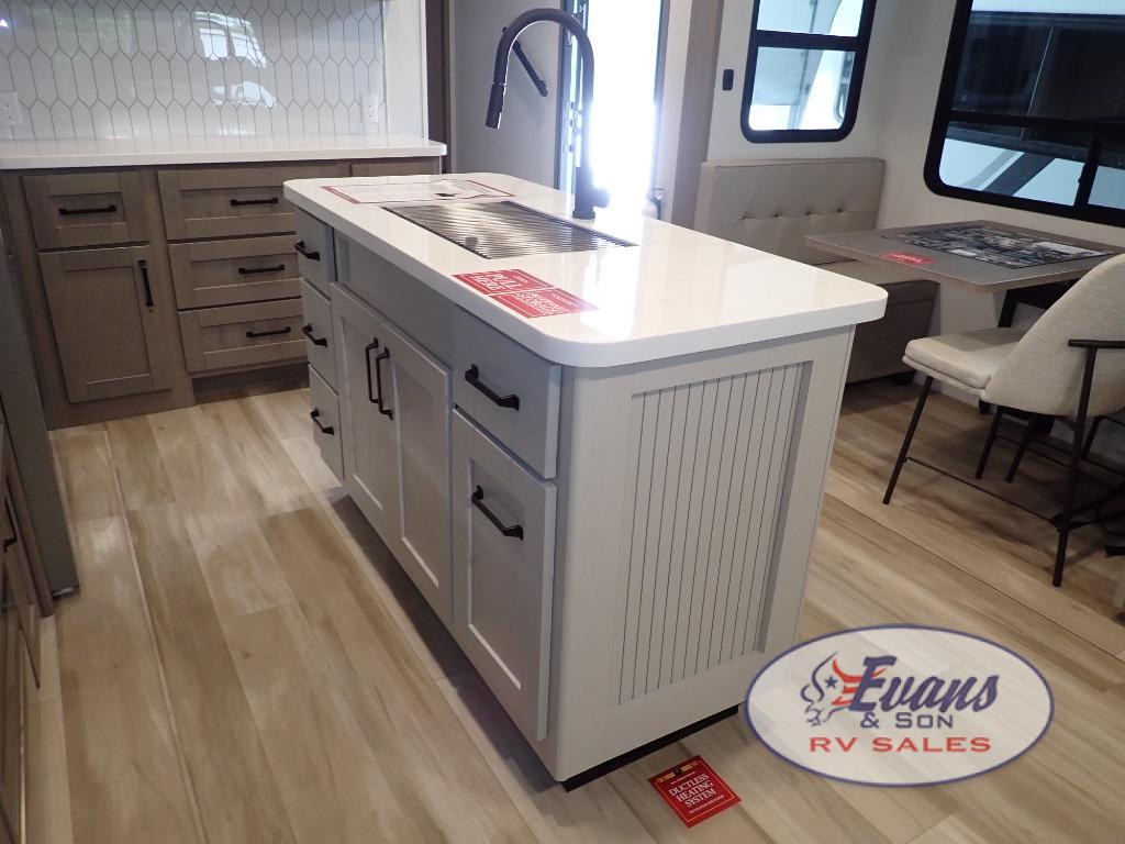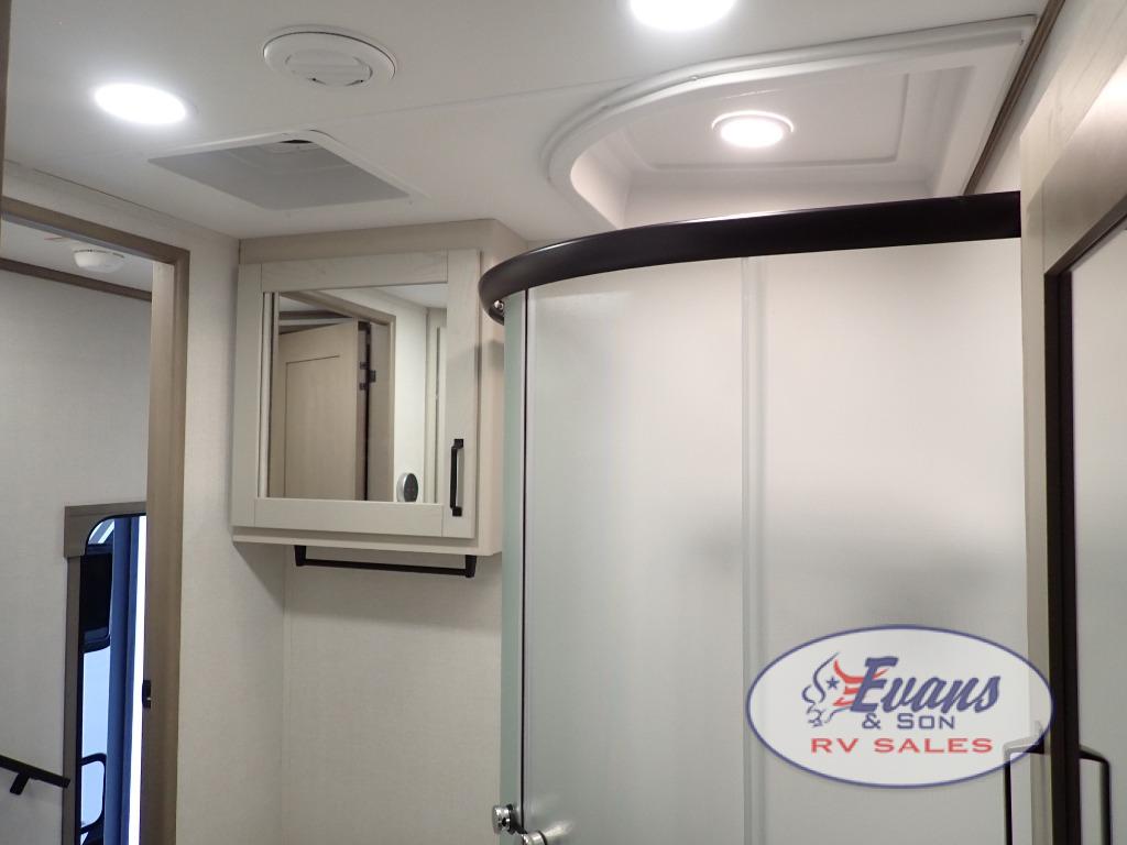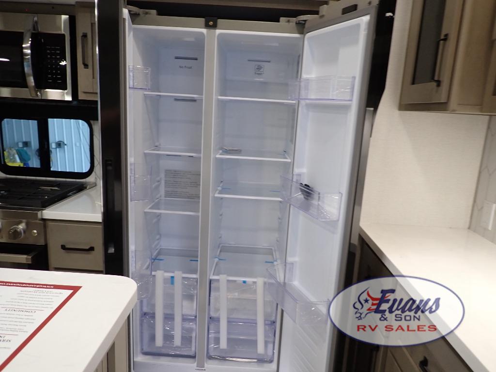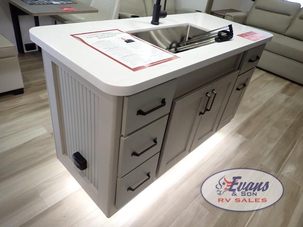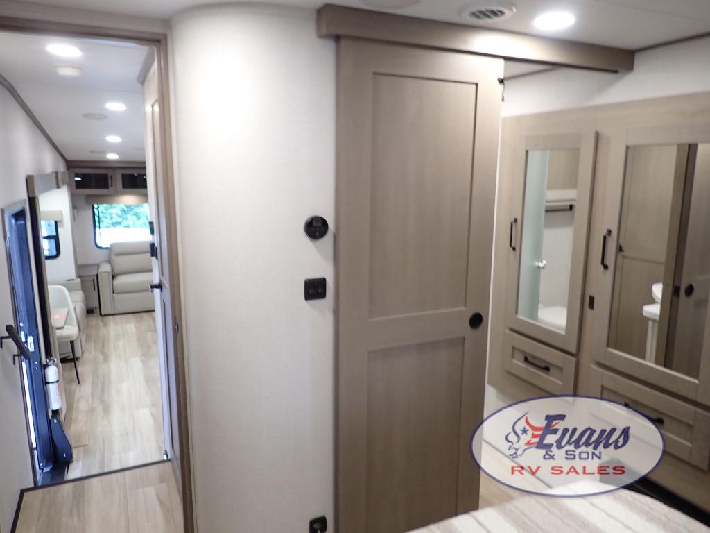 Whether you travel for pleasure or work, you will love the spacious main living and kitchen area with a rear tri-fold sofa that doubles as extra sleeping space, and the theater seating directly across from the entertainment center with a 40" LED HDTV and a fireplace below. The kitchen island will make meal prepping and drying the dishes easier and the hutch is the perfect place to place your picture frames, nice dishes, and extra cooking items. There is even a pantry that is big enough to store all of your favorite snacks, dry ingredients and such. Outside you can enjoy two electric awnings that provide protection from the elements as you relax and visit with other RVers, and your camping chairs can easily be stored in the pass-through compartment. The double entry bathroom is convenient especially at night when you can slide the door to enter from the front master bedroom. You will find plenty of storage for your clothing and gear, plus the bedroom slide out gives you drawers and linen storage that stretches into the full bathroom.