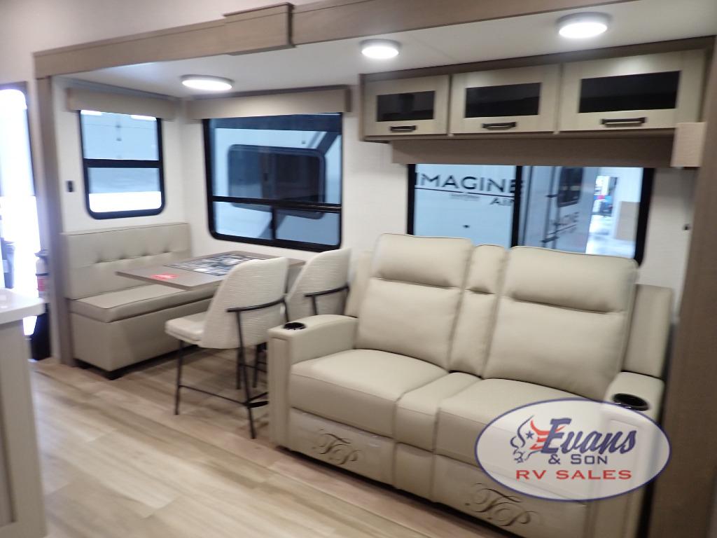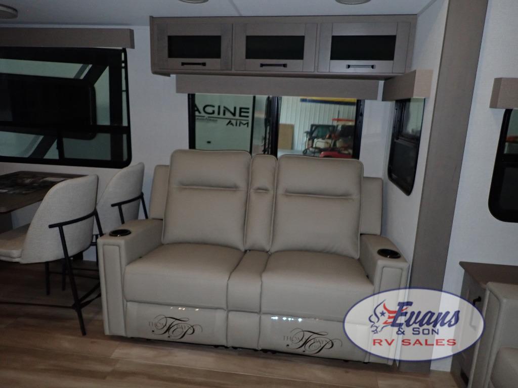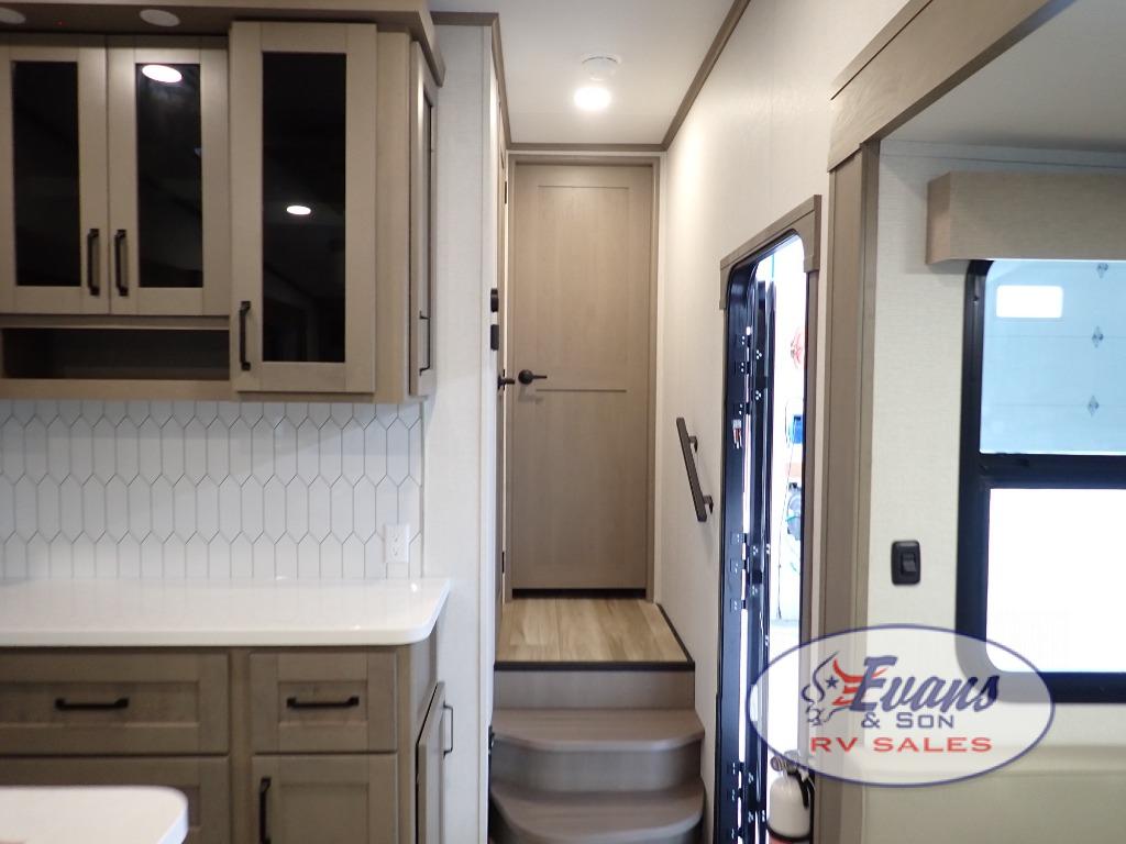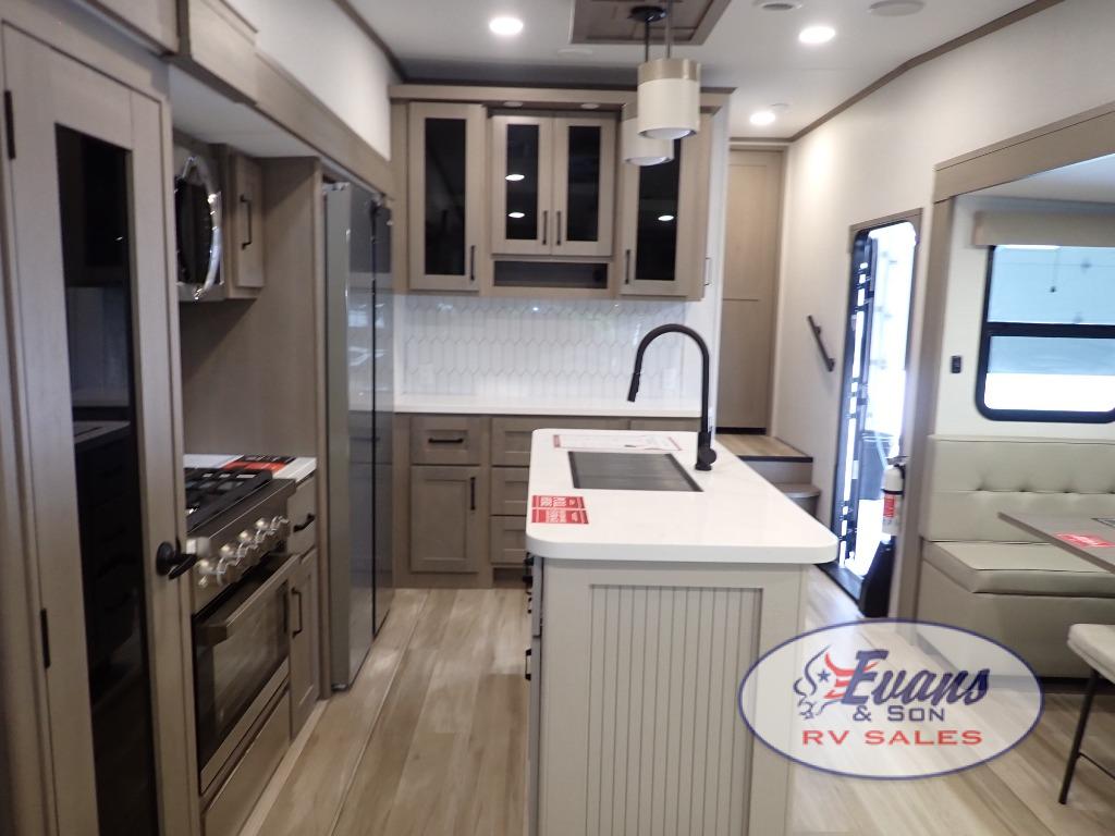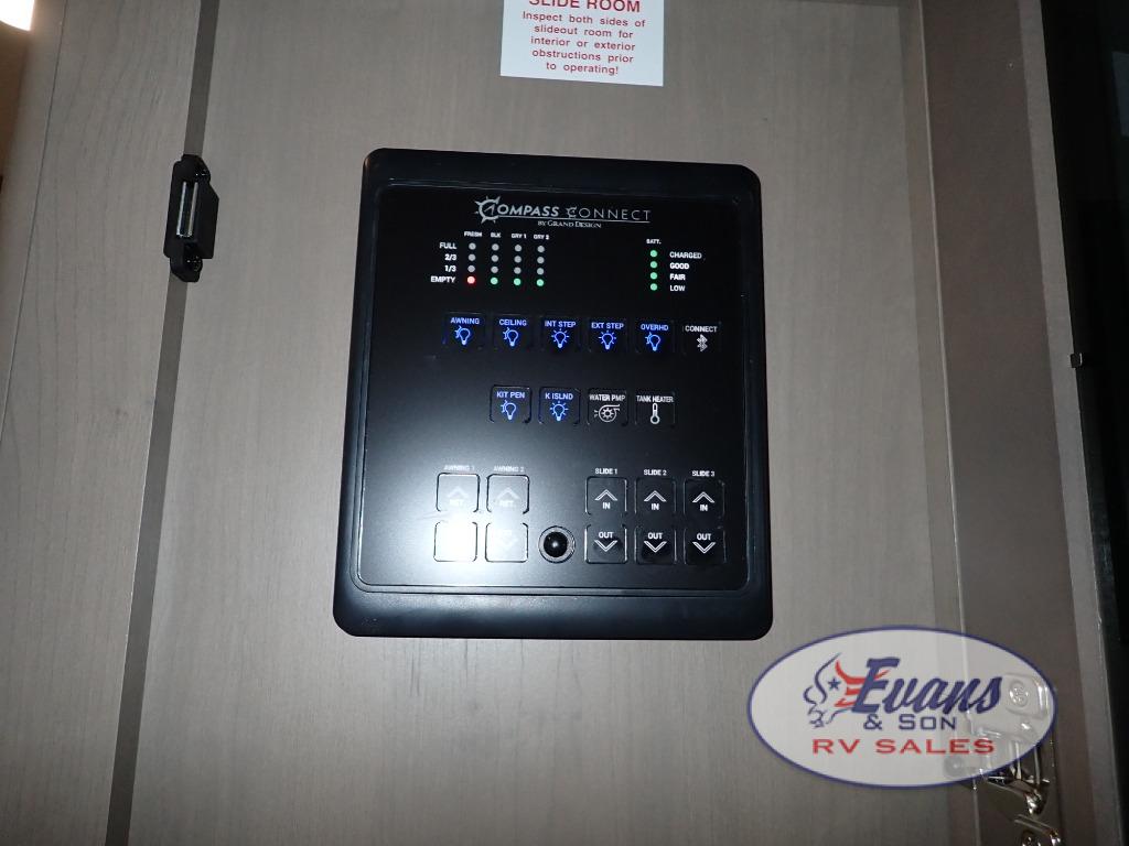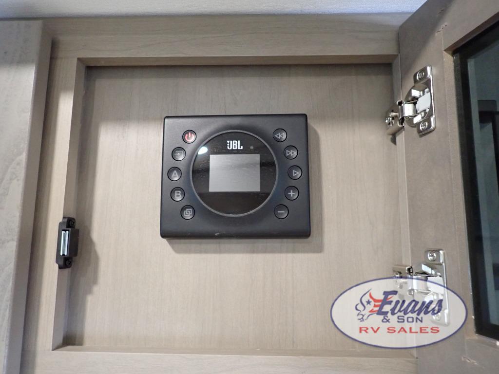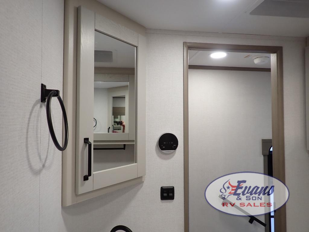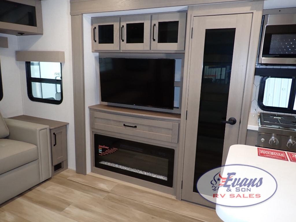 Whether you travel for pleasure or work, you will love the spacious main living and kitchen area with a rear tri-fold sofa that doubles as extra sleeping space, and the theater seating directly across from the entertainment center with a 40" LED HDTV and a fireplace below. The kitchen island will make meal prepping and drying the dishes easier and the hutch is the perfect place to place your picture frames, nice dishes, and extra cooking items. There is even a pantry that is big enough to store all of your favorite snacks, dry ingredients and such. Outside you can enjoy two electric awnings that provide protection from the elements as you relax and visit with other RVers, and your camping chairs can easily be stored in the pass-through compartment. The double entry bathroom is convenient especially at night when you can slide the door to enter from the front master bedroom. You will find plenty of storage for your clothing and gear, plus the bedroom slide out gives you drawers and linen storage that stretches into the full bathroom.