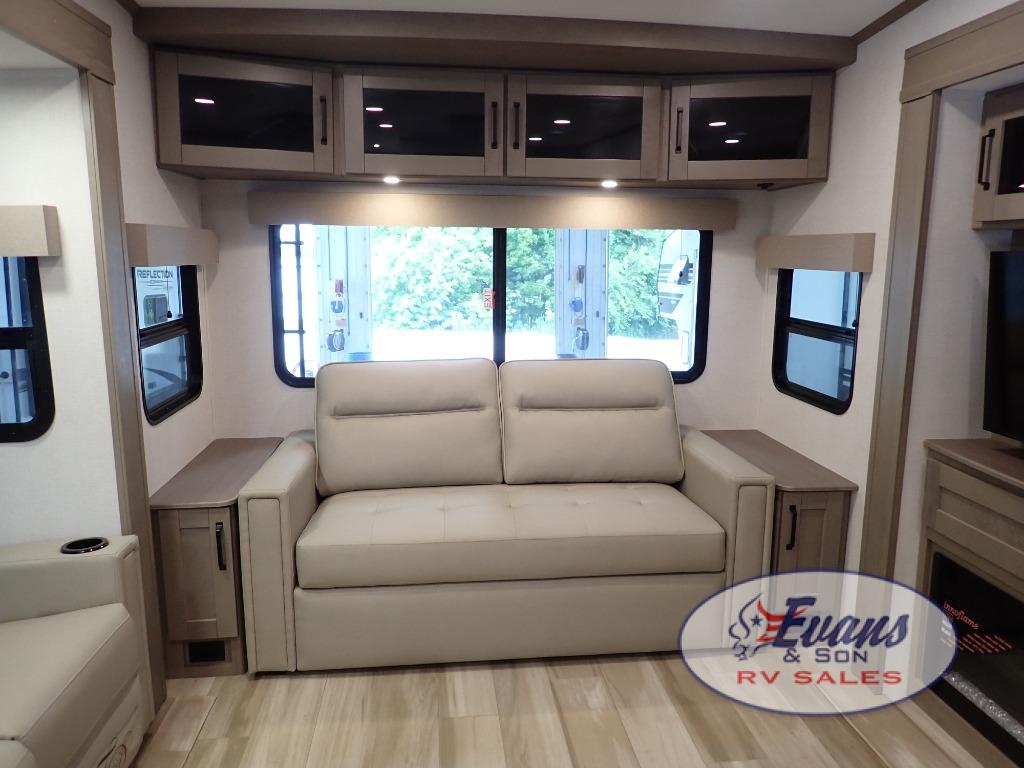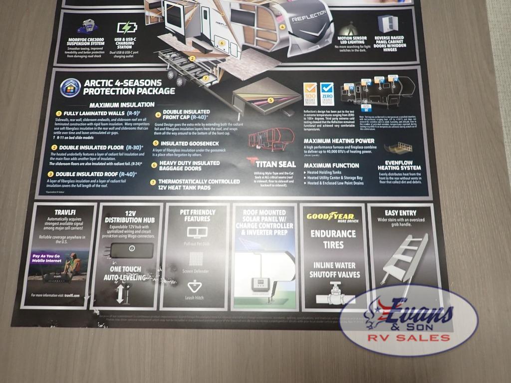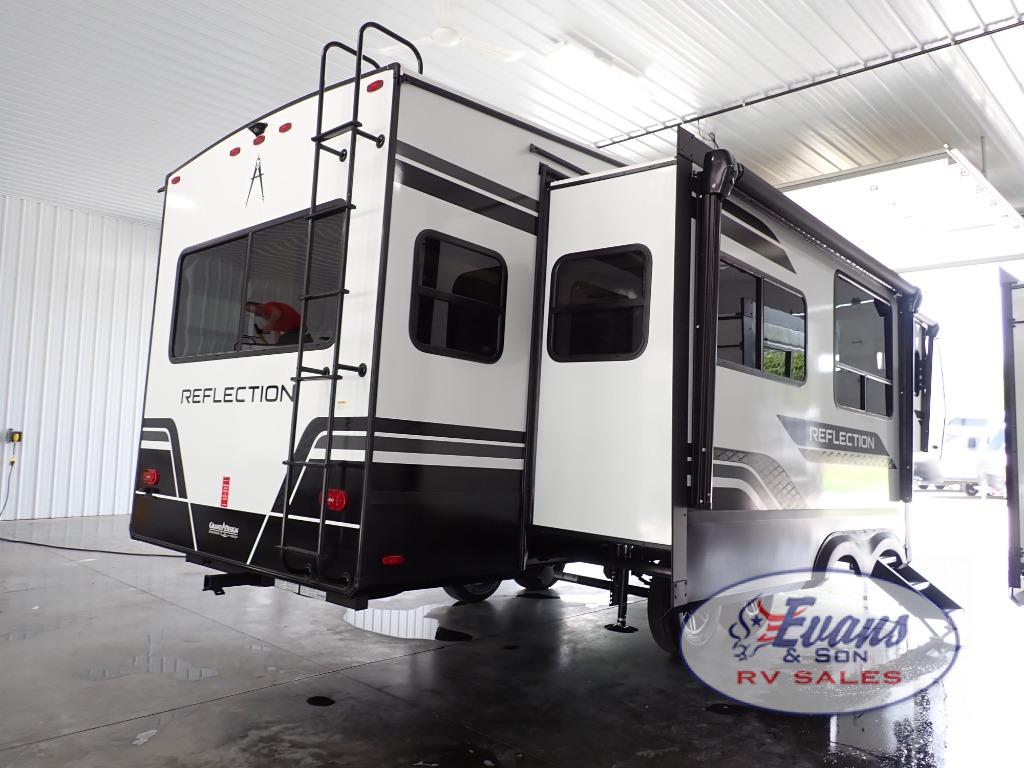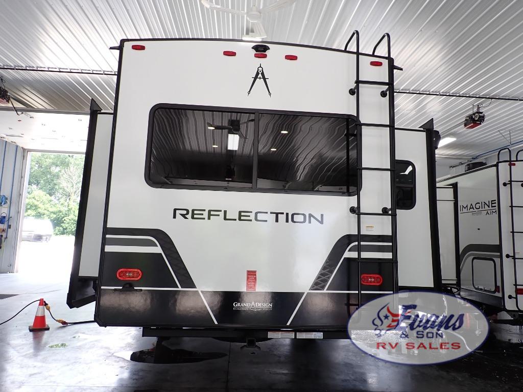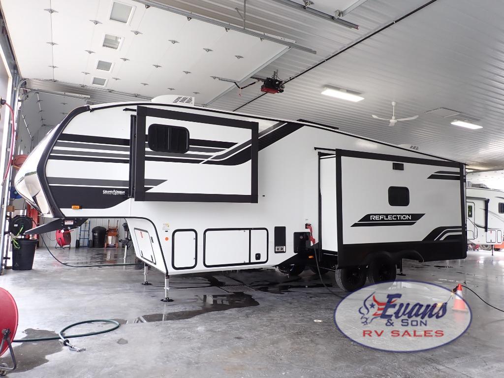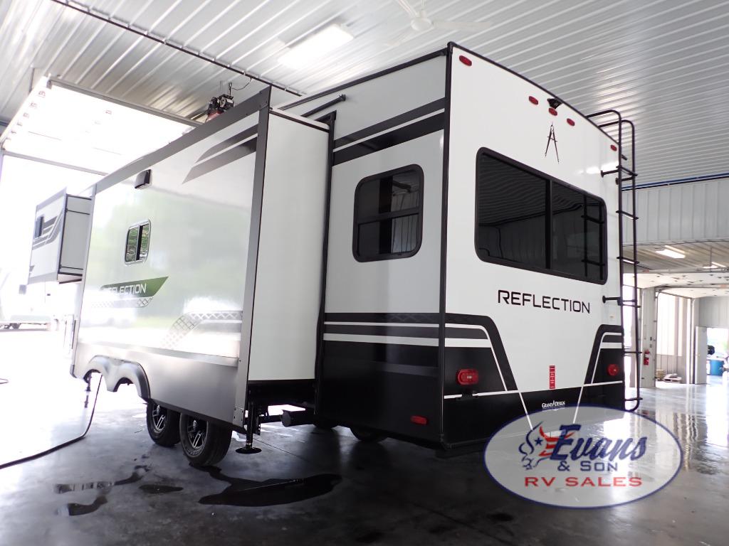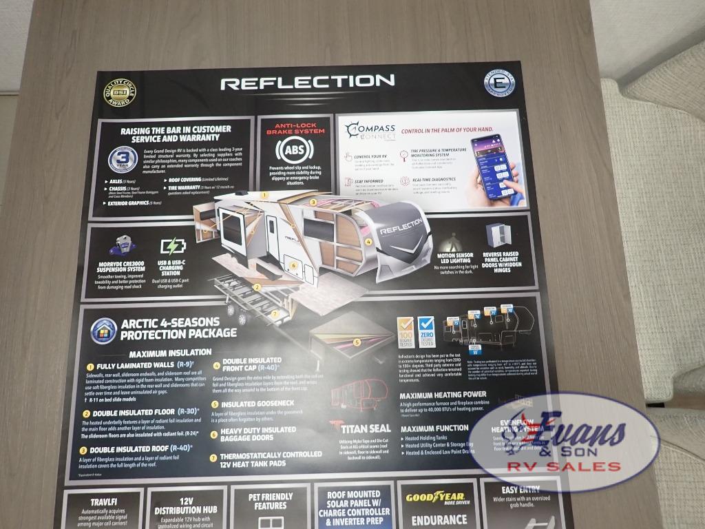 With any Reflection fifth wheel by Grand Design, you will have a solar panel for off-grid camping and a 60 amp charge controller and inverter prep, a Universal All-In-One docking station, unobstructed pass-through storage, and Goodyear Endurance tires. Each is constructed of gel coat exterior sidewalls, residential 5" truss rafters, walk-on roof decking, a fiberglass and radiant foil roof and front cap insulation plus laminated aluminum framed side walls, roof and end walls in slide rooms. Head inside to enjoy residential hardwood cabinet doors, premium Congoleum flooring, a spacious shower with a glass door, and many more comforts!