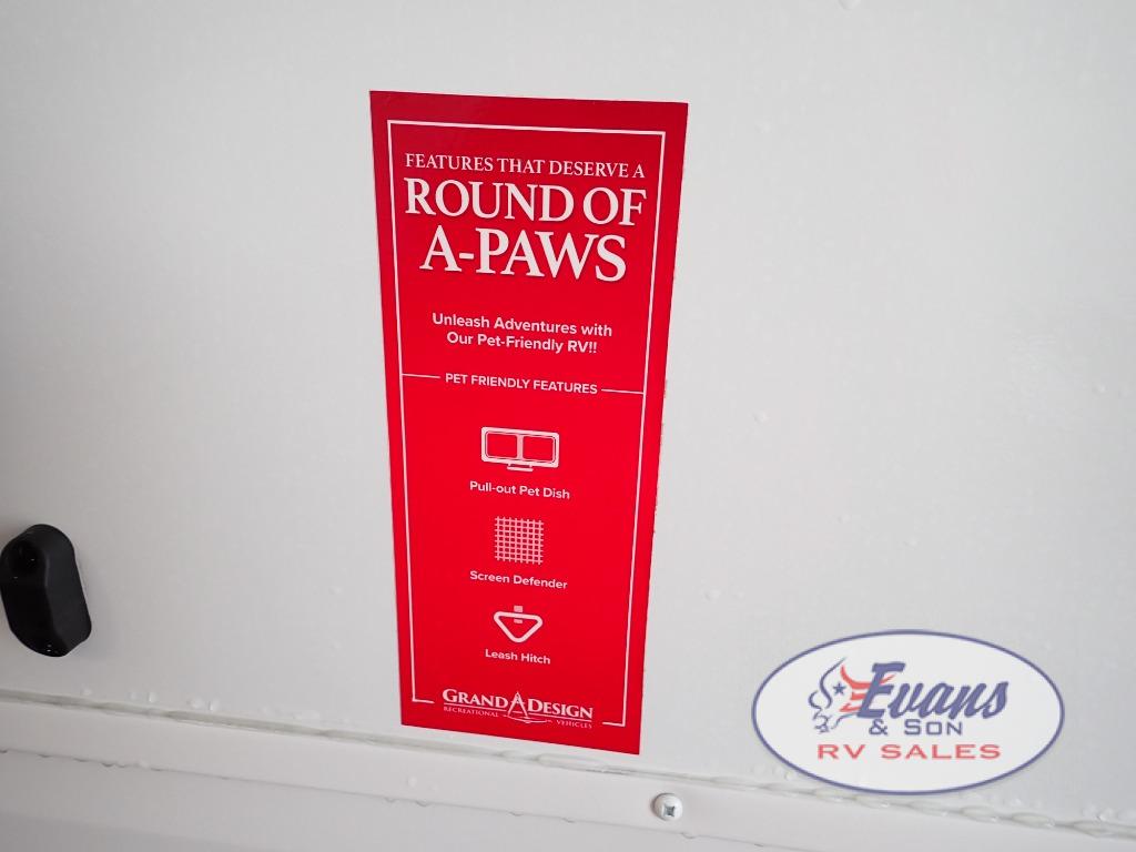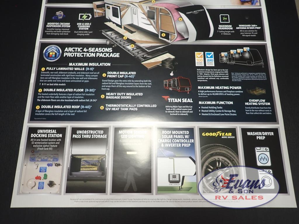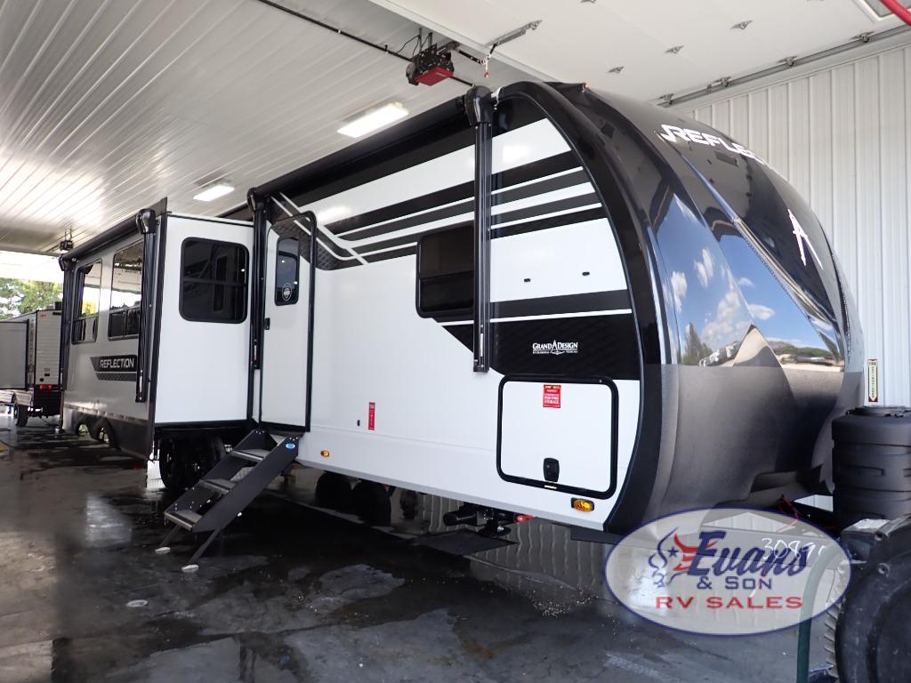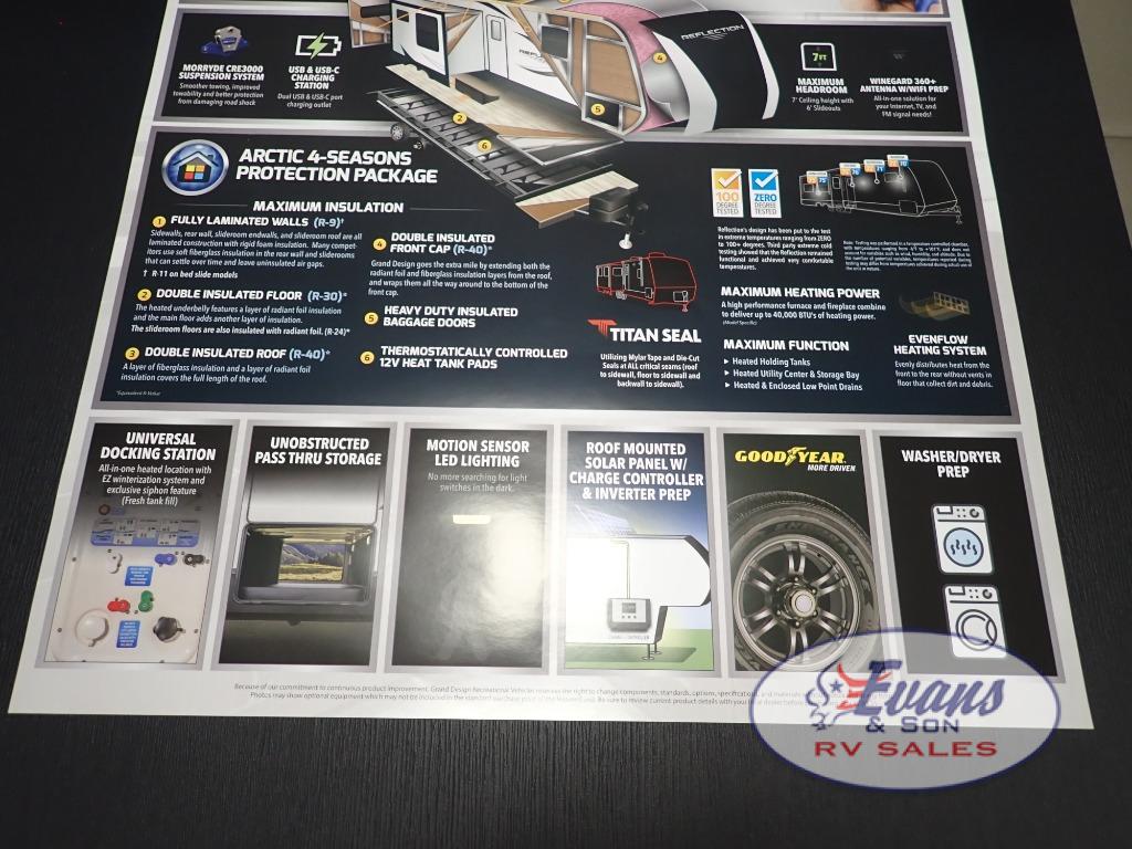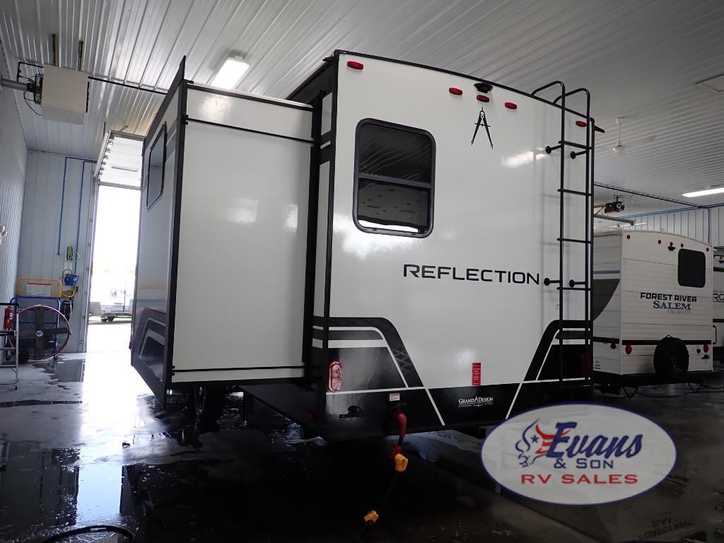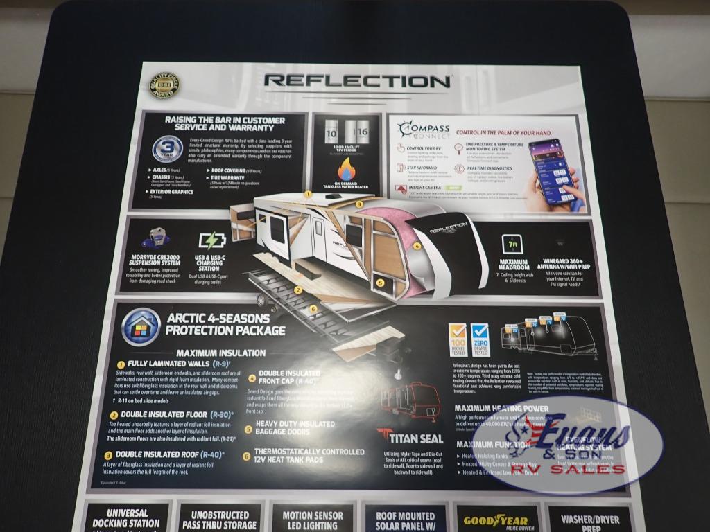 With any Reflection travel trailer by Grand Design, you will have a solar panel for off-grid camping and a 60 amp charge controller and inverter prep, a Universal All-In-One docking station, unobstructed pass-through storage, and Goodyear Endurance tires. Each is constructed of gel coat exterior sidewalls, residential 5" truss rafters, walk-on roof decking, a fiberglass and radiant foil roof and front cap insulation plus laminated aluminum framed side walls, roof and end walls in slide rooms. Head inside to enjoy residential hardwood cabinet doors, premium Congoleum flooring, a spacious shower with a glass door, and many more comforts!