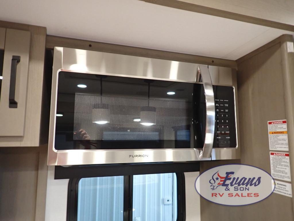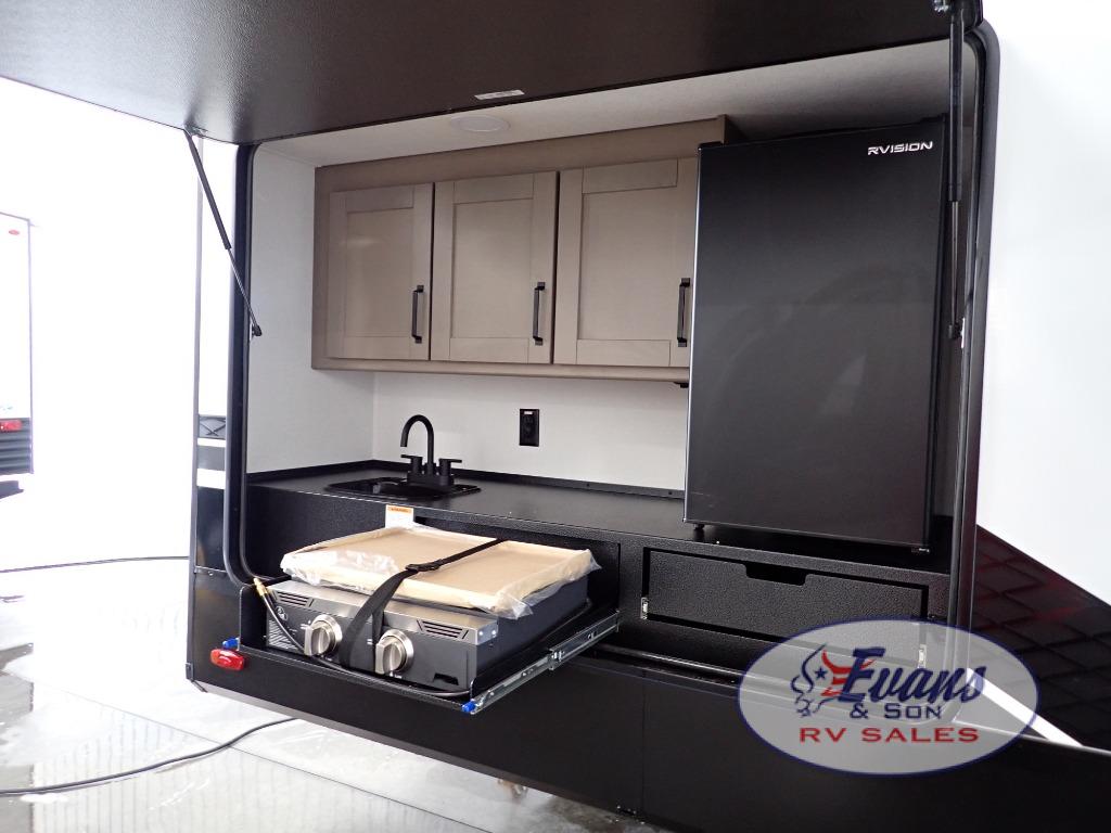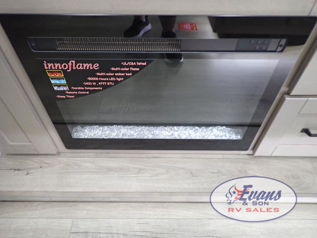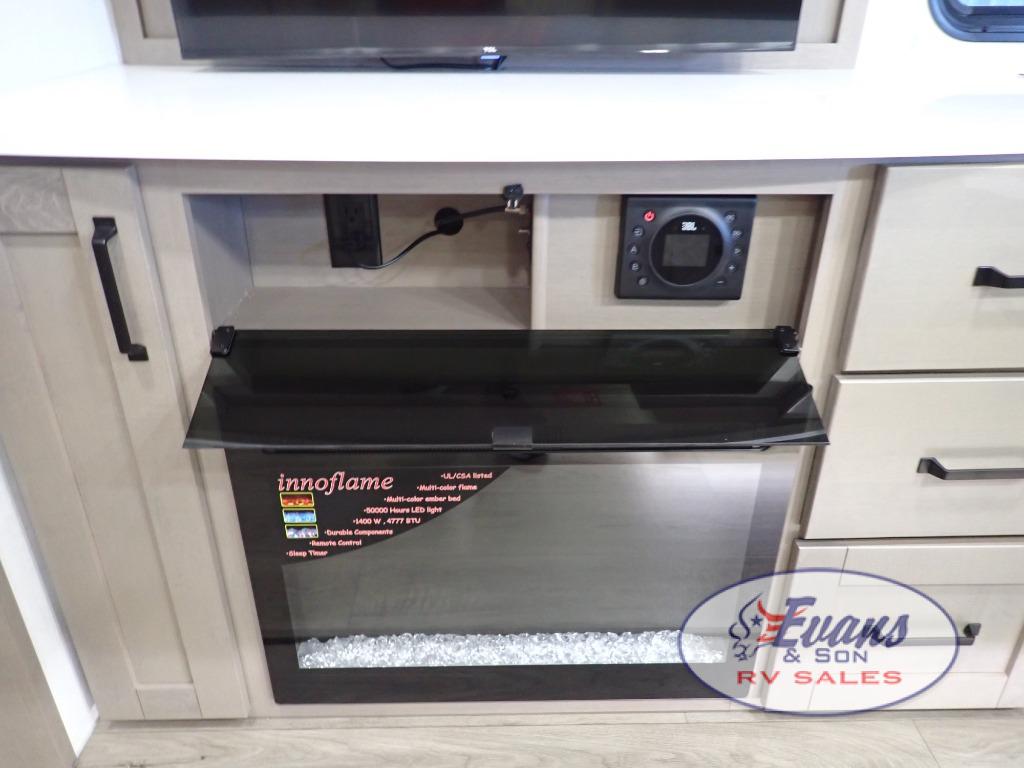 Finding the perfect trailer for a larger group is simple, take a look at this one for your next RV! The rear bunkhouse might be the first reason you fall in love because of the slide out with a flip bunk above a tri-fold sofa, the second bunk bed with a window on the opposite side and storage below, and the large rear window for great views. The outside kitchen might be another reason allowing you to enjoy the outdoors while providing meals for everyone, and/or the inside gourmet kitchen with a 16 cu. ft. refrigerator, an island, and two hutches. Everyone can gather together and relax on the theater seating with cupholders and the booth dinette or optional swivel dinette, or watch the 40" LED HDTV with fireplace below. The full bathroom includes a space savings sliding door and linen storage, and the bedroom gives you a front walk-around queen bed with storage for your clothes on each side, plus there is an additional wardrobe with drawers for your clothes!