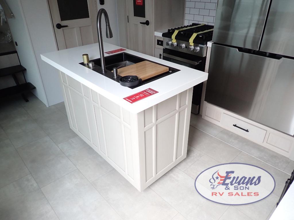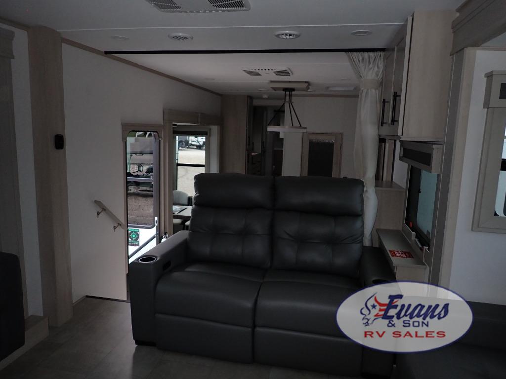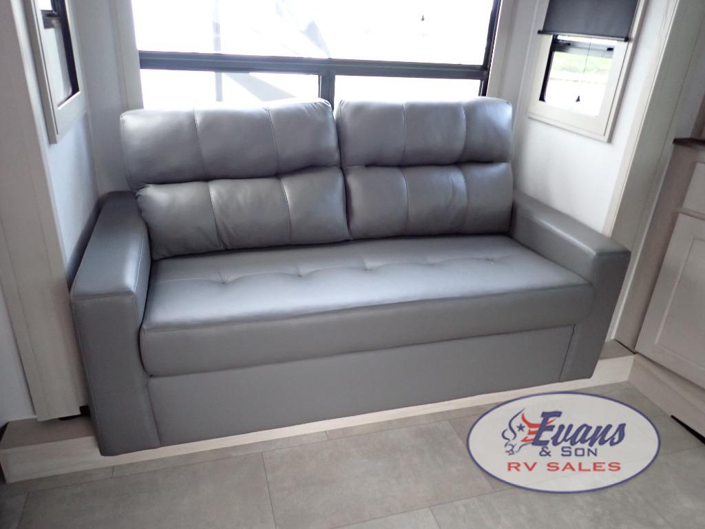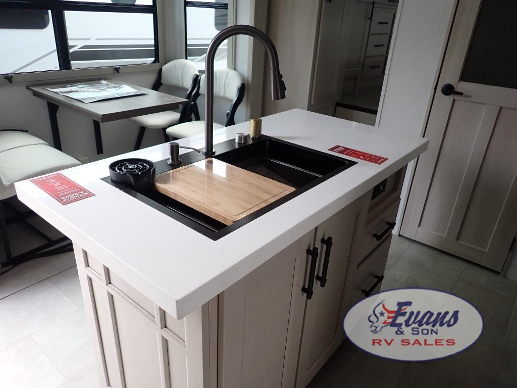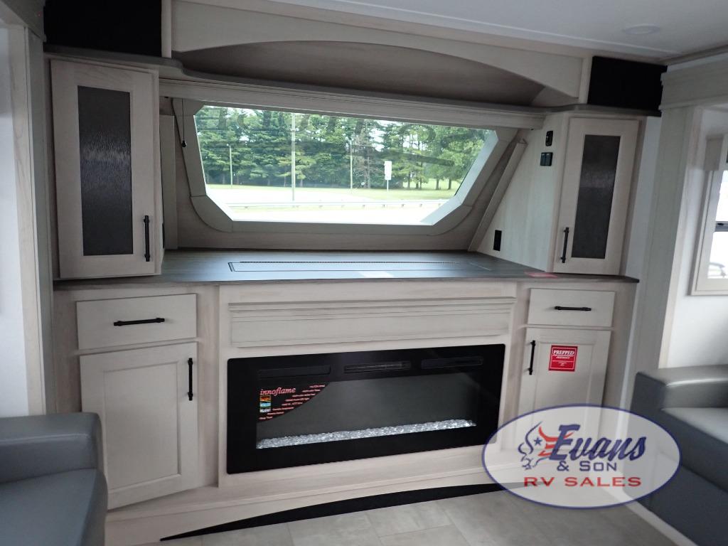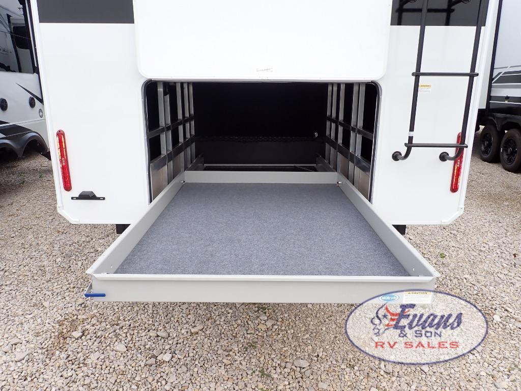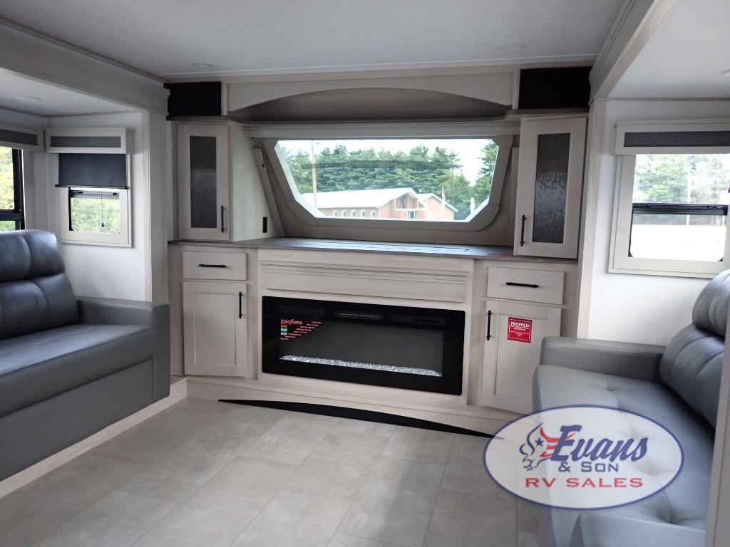 Five slide outs, a full bathroom with dual sinks, a half bath off of the kitchen, and a separate front living room and entertainment area are a few reasons you will enjoy your time spent in this fifth wheel! The separate kitchen is a dream with stainless steel appliances including a built-in oven, a pantry and hutch with counter space, a kitchen island plus a free-standing dinette slide with windows for great views. The entertainment center offers an LED Smart TV with a fireplace below and storage, and the dual opposing tri-fold sofas provide added sleeping space at night. The master bedroom includes a queen bed plus space savings sliding doors that lead you to the rear full bathroom with dual sinks, linen storage, and washer/dryer prep. The exterior has several storage choices as well including a pass-through compartment for fishing poles and such, plus the unique sliding tray in the rear allows you to bring along larger items such as camping tables, portable grills, golf clubs, totes and more.