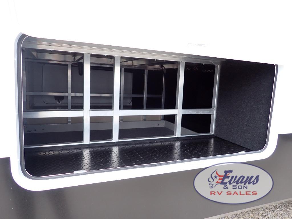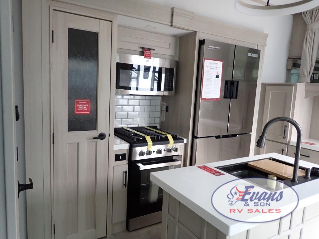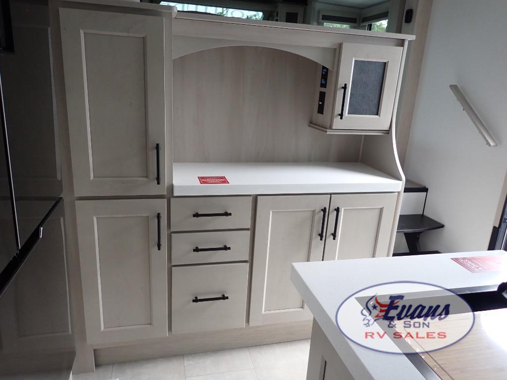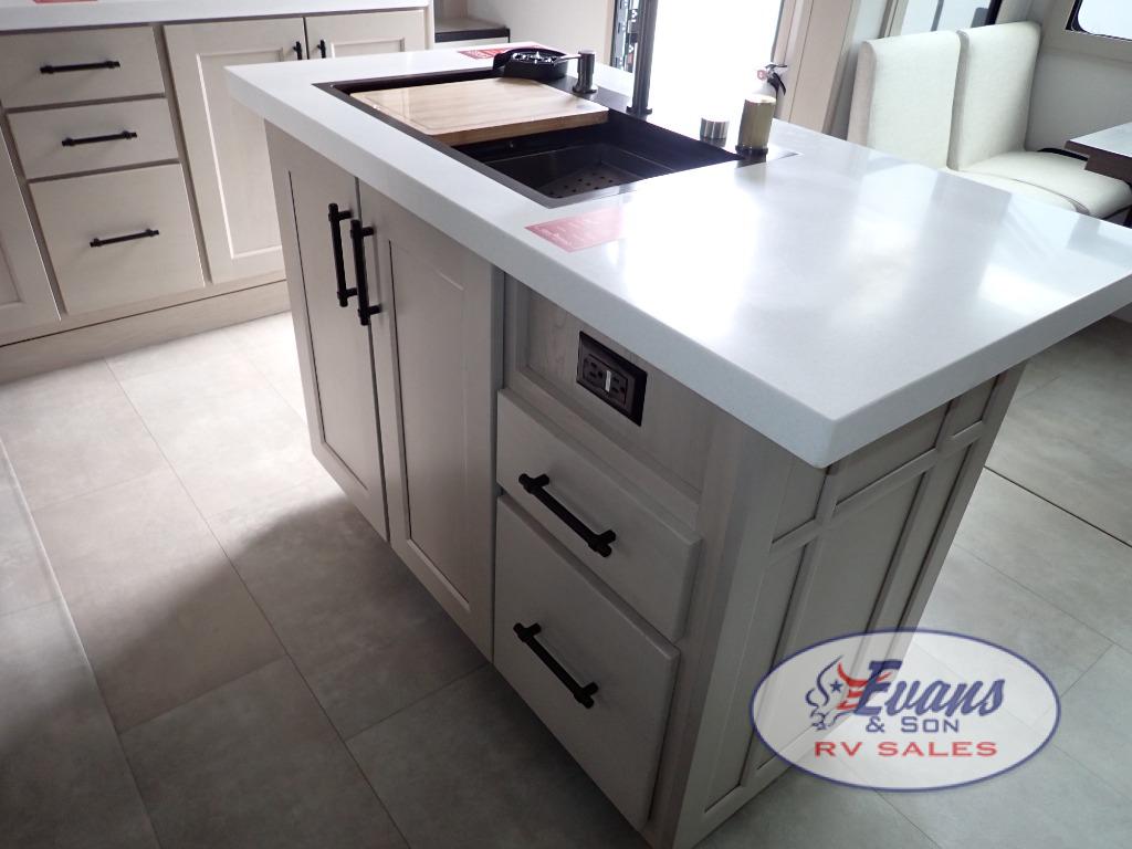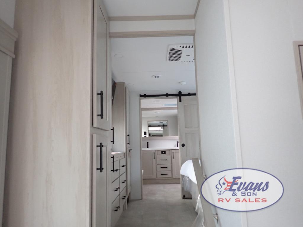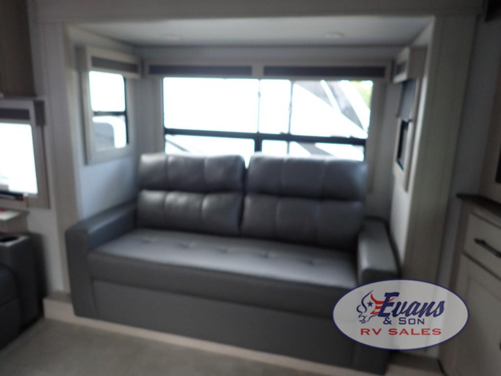 Five slide outs, a full bathroom with dual sinks, a half bath off of the kitchen, and a separate front living room and entertainment area are a few reasons you will enjoy your time spent in this fifth wheel! The separate kitchen is a dream with stainless steel appliances including a built-in oven, a pantry and hutch with counter space, a kitchen island plus a free-standing dinette slide with windows for great views. The entertainment center offers an LED Smart TV with a fireplace below and storage, and the dual opposing tri-fold sofas provide added sleeping space at night. The master bedroom includes a queen bed plus space savings sliding doors that lead you to the rear full bathroom with dual sinks, linen storage, and washer/dryer prep. The exterior has several storage choices as well including a pass-through compartment for fishing poles and such, plus the unique sliding tray in the rear allows you to bring along larger items such as camping tables, portable grills, golf clubs, totes and more.