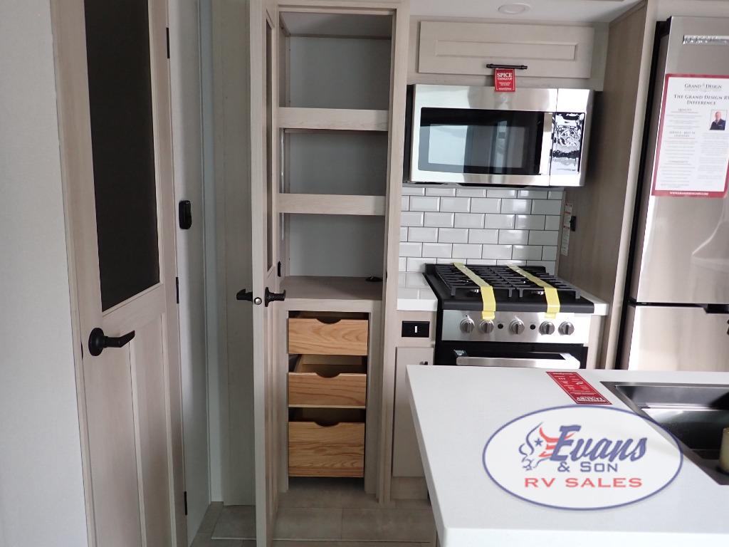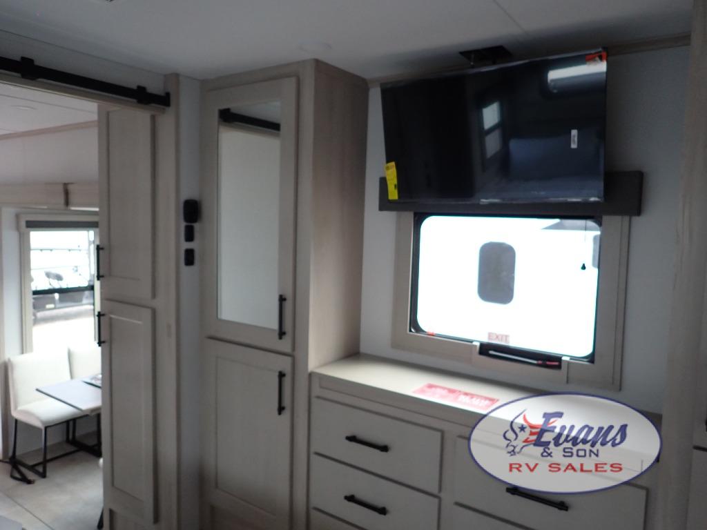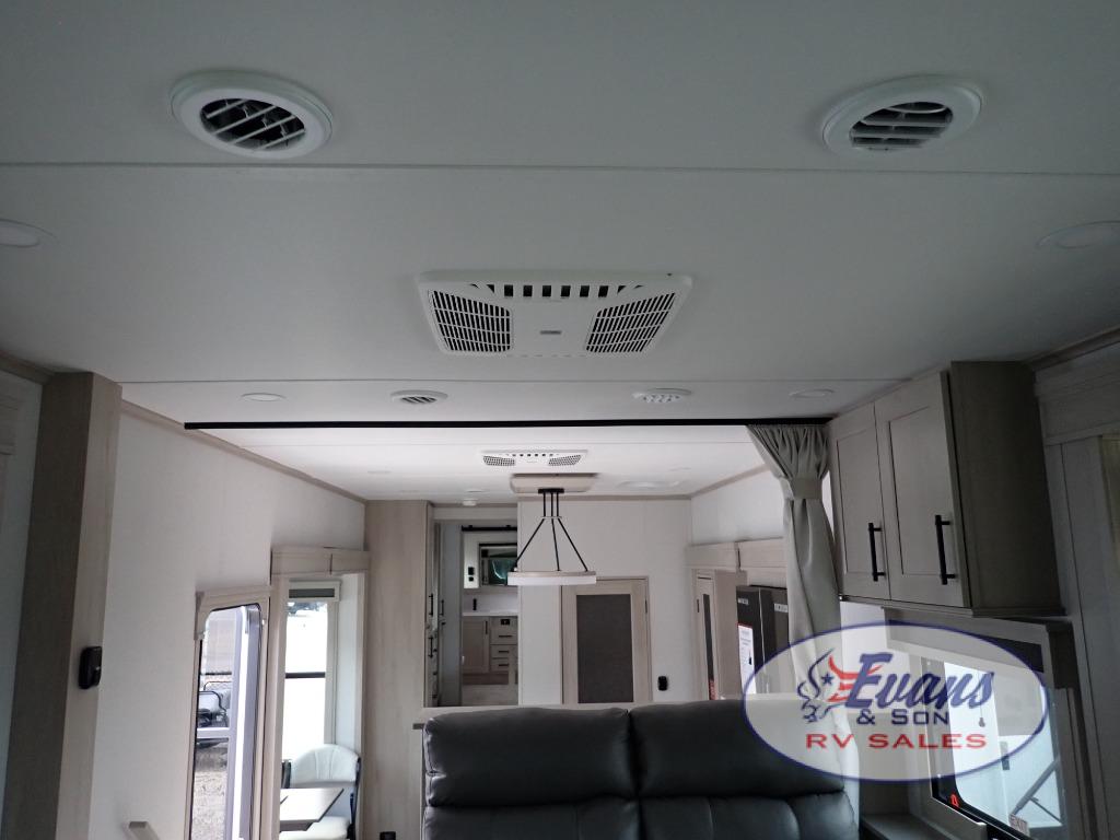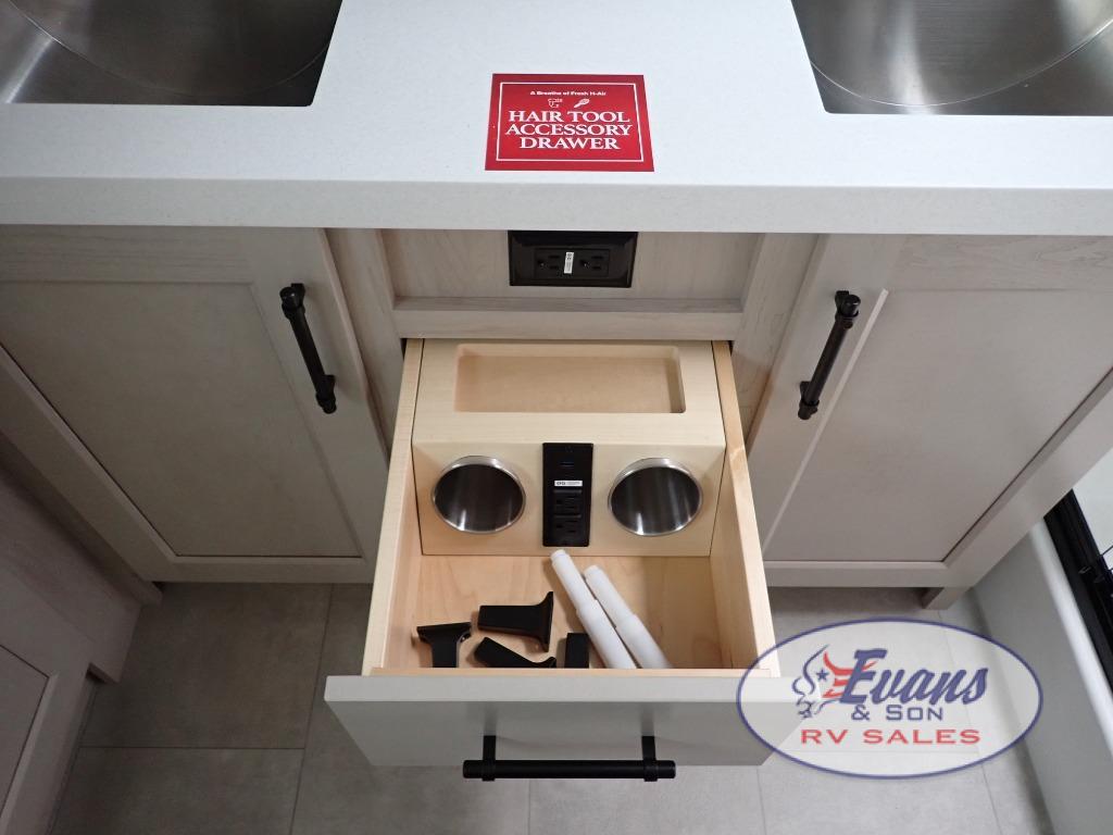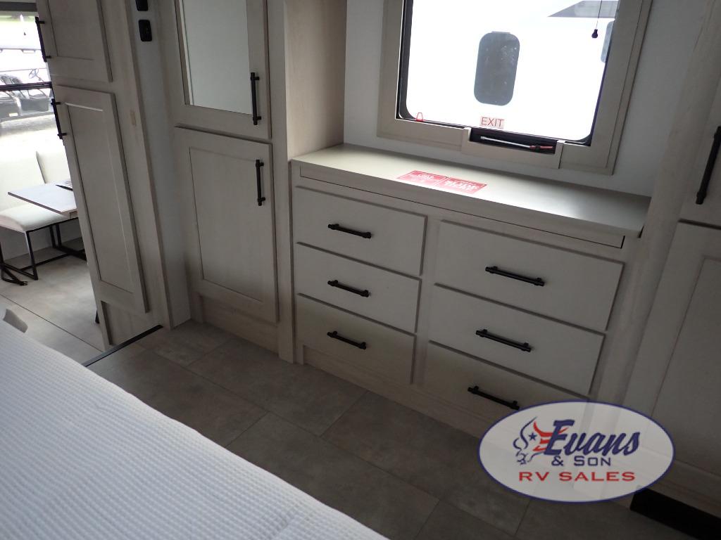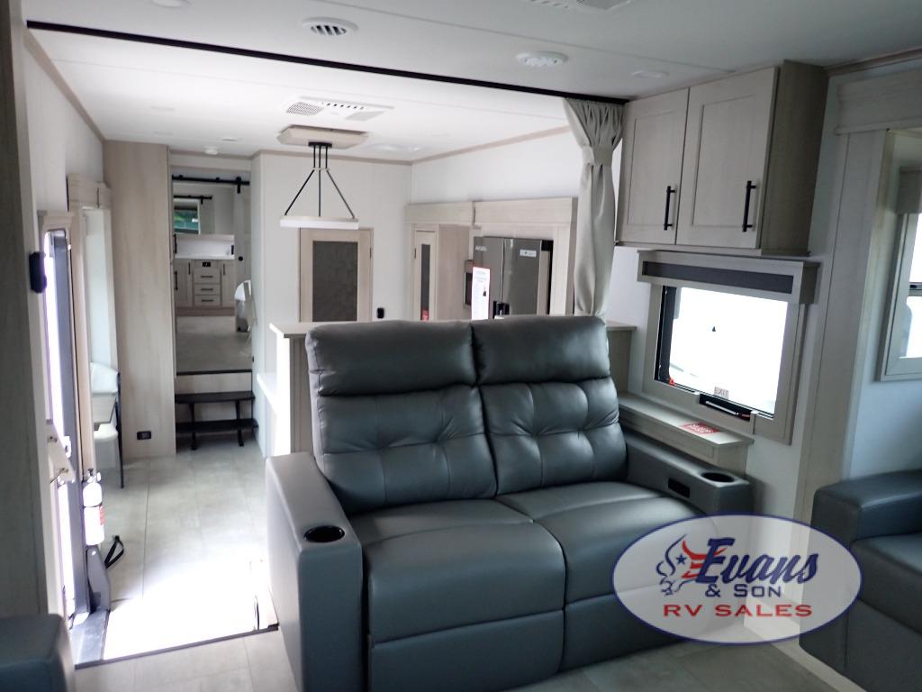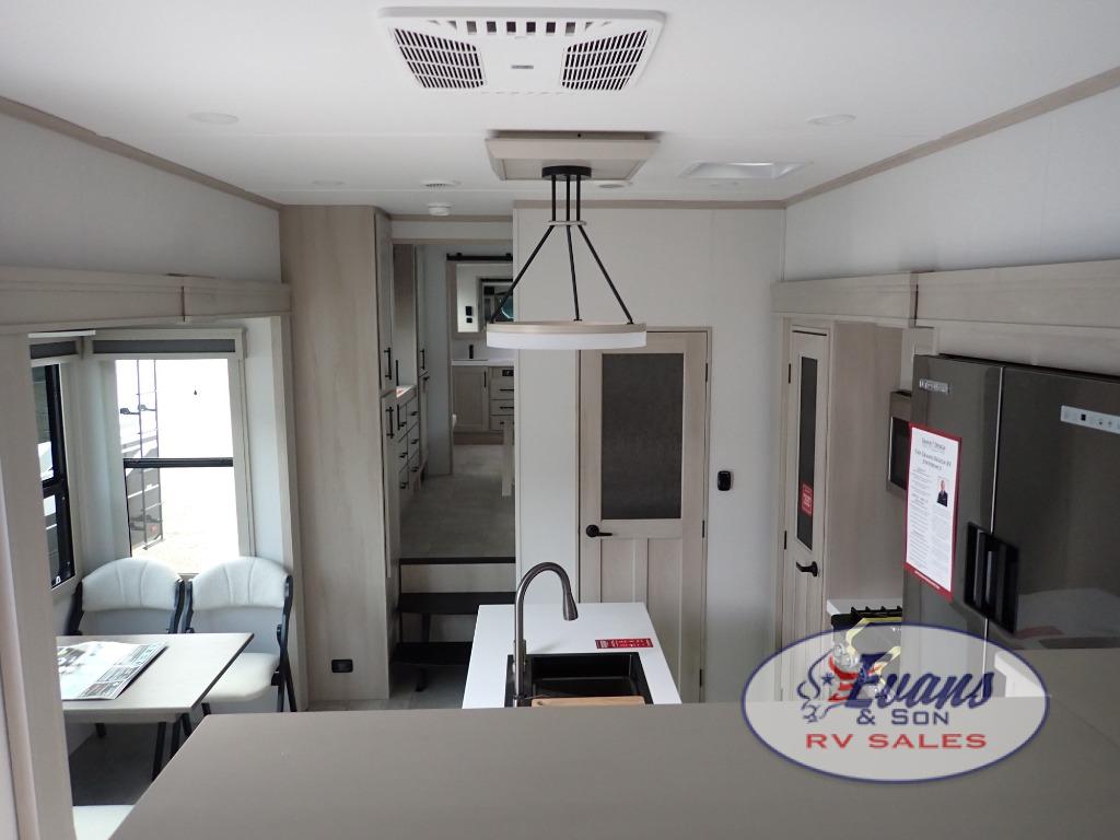 Five slide outs, a full bathroom with dual sinks, a half bath off of the kitchen, and a separate front living room and entertainment area are a few reasons you will enjoy your time spent in this fifth wheel! The separate kitchen is a dream with stainless steel appliances including a built-in oven, a pantry and hutch with counter space, a kitchen island plus a free-standing dinette slide with windows for great views. The entertainment center offers an LED Smart TV with a fireplace below and storage, and the dual opposing tri-fold sofas provide added sleeping space at night. The master bedroom includes a queen bed plus space savings sliding doors that lead you to the rear full bathroom with dual sinks, linen storage, and washer/dryer prep. The exterior has several storage choices as well including a pass-through compartment for fishing poles and such, plus the unique sliding tray in the rear allows you to bring along larger items such as camping tables, portable grills, golf clubs, totes and more.