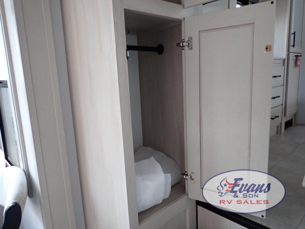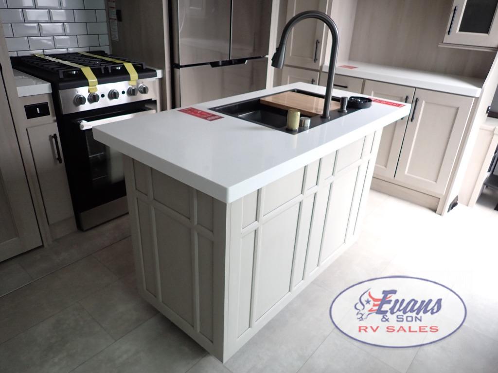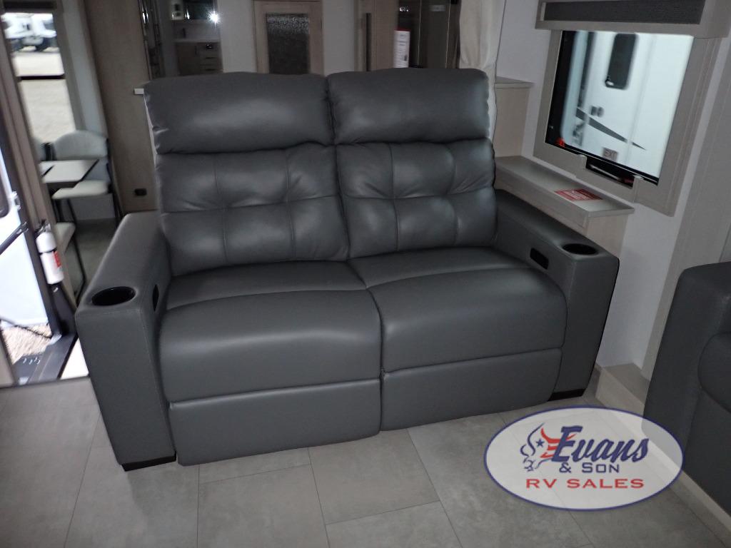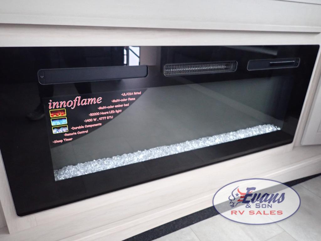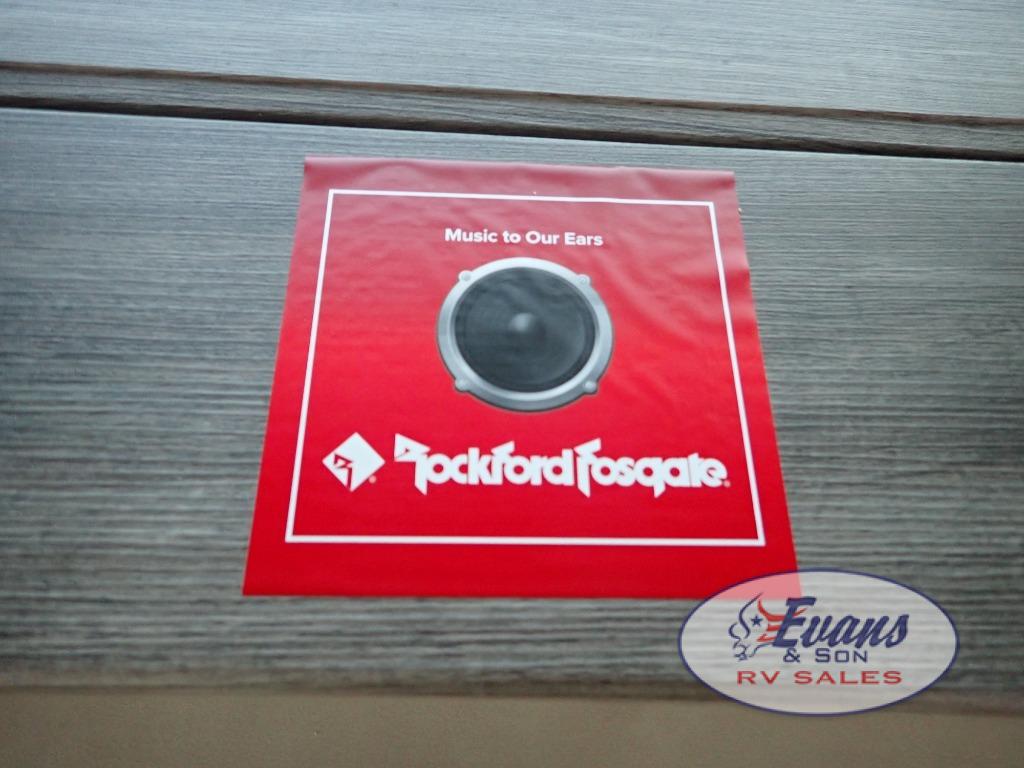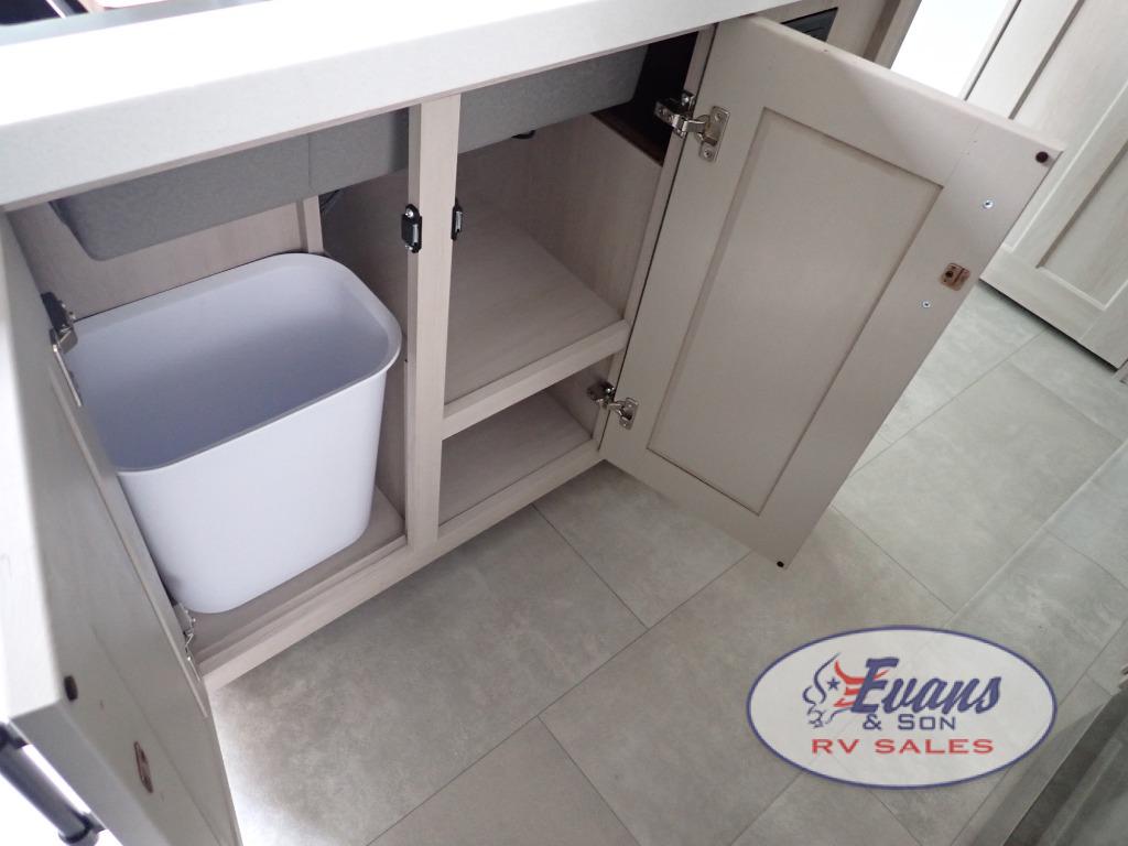 Five slide outs, a full bathroom with dual sinks, a half bath off of the kitchen, and a separate front living room and entertainment area are a few reasons you will enjoy your time spent in this fifth wheel! The separate kitchen is a dream with stainless steel appliances including a built-in oven, a pantry and hutch with counter space, a kitchen island plus a free-standing dinette slide with windows for great views. The entertainment center offers an LED Smart TV with a fireplace below and storage, and the dual opposing tri-fold sofas provide added sleeping space at night. The master bedroom includes a queen bed plus space savings sliding doors that lead you to the rear full bathroom with dual sinks, linen storage, and washer/dryer prep. The exterior has several storage choices as well including a pass-through compartment for fishing poles and such, plus the unique sliding tray in the rear allows you to bring along larger items such as camping tables, portable grills, golf clubs, totes and more.