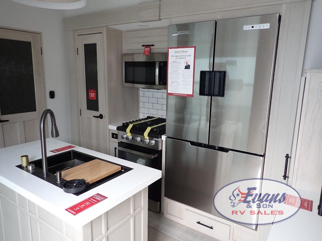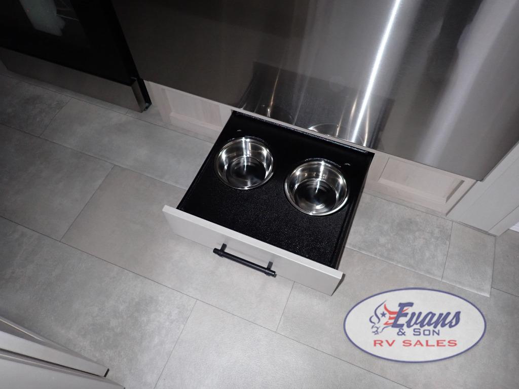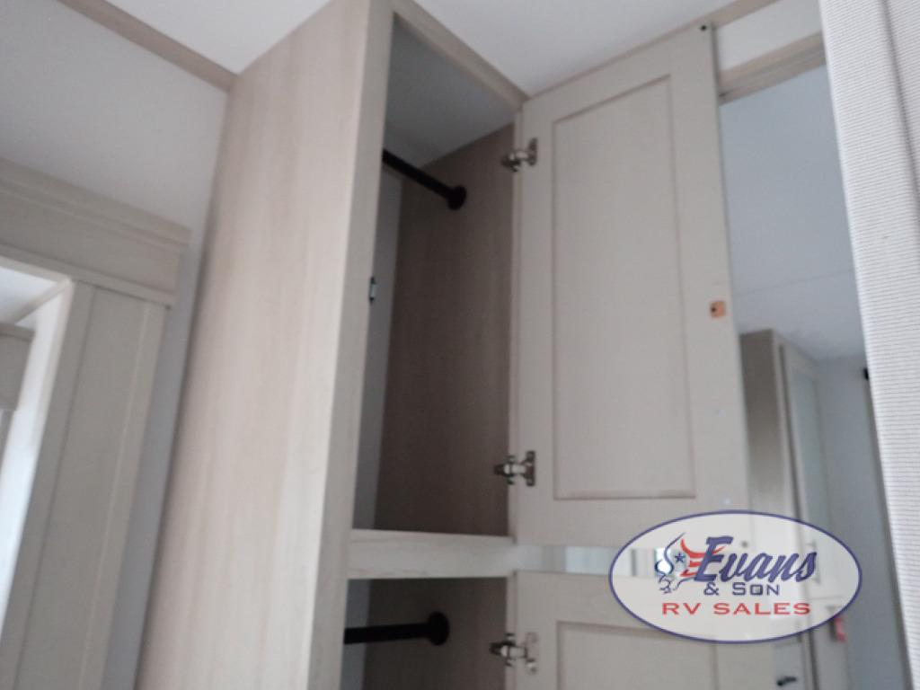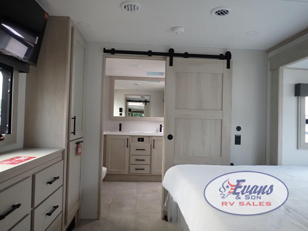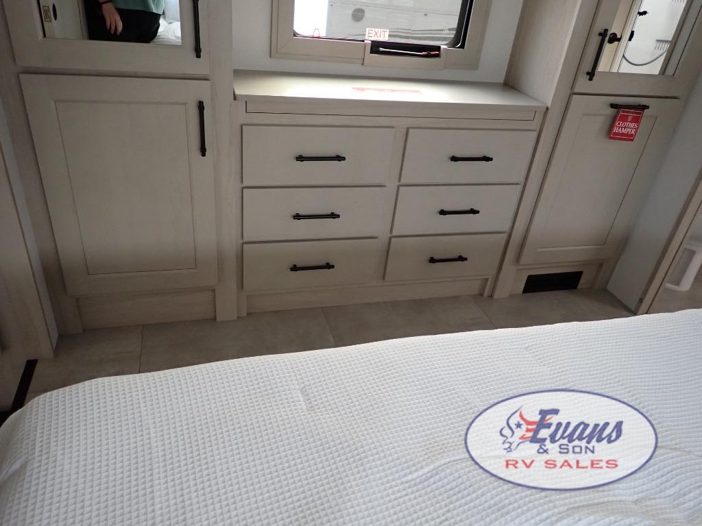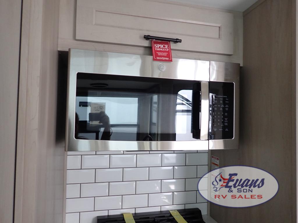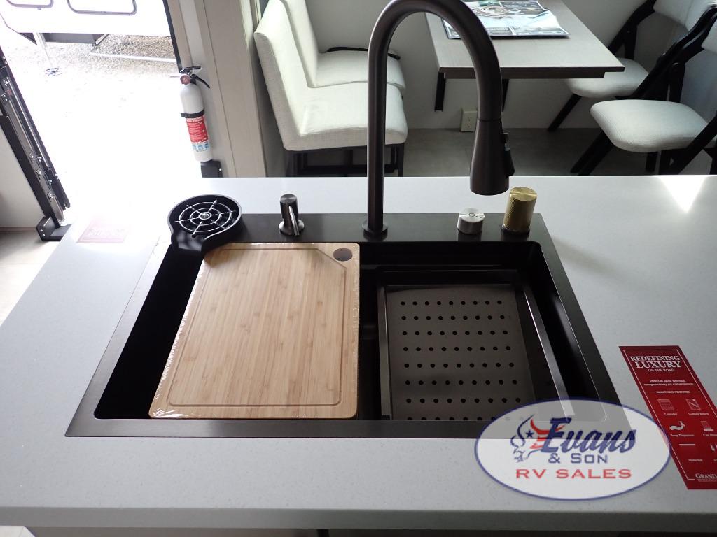 Five slide outs, a full bathroom with dual sinks, a half bath off of the kitchen, and a separate front living room and entertainment area are a few reasons you will enjoy your time spent in this fifth wheel! The separate kitchen is a dream with stainless steel appliances including a built-in oven, a pantry and hutch with counter space, a kitchen island plus a free-standing dinette slide with windows for great views. The entertainment center offers an LED Smart TV with a fireplace below and storage, and the dual opposing tri-fold sofas provide added sleeping space at night. The master bedroom includes a queen bed plus space savings sliding doors that lead you to the rear full bathroom with dual sinks, linen storage, and washer/dryer prep. The exterior has several storage choices as well including a pass-through compartment for fishing poles and such, plus the unique sliding tray in the rear allows you to bring along larger items such as camping tables, portable grills, golf clubs, totes and more.