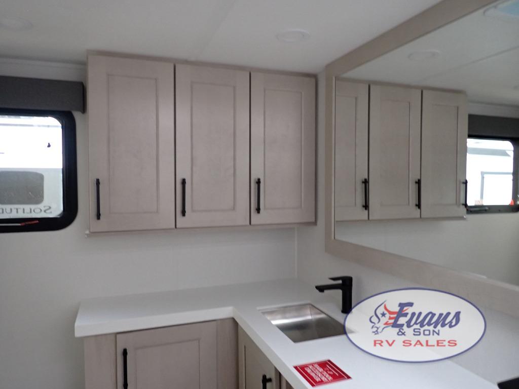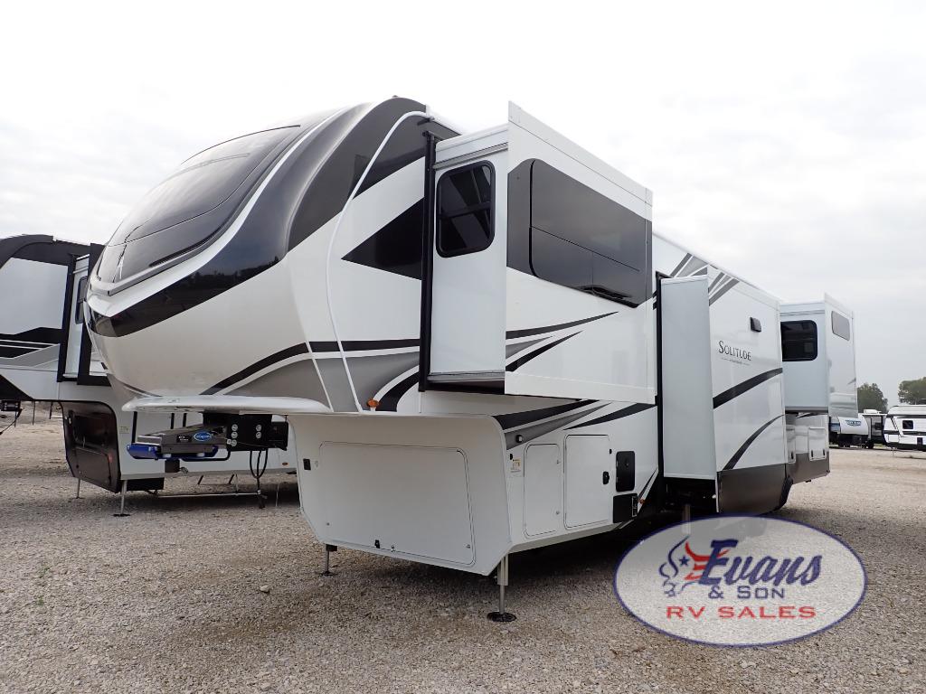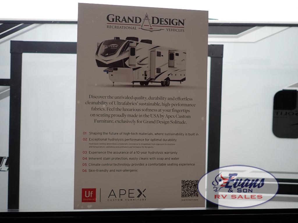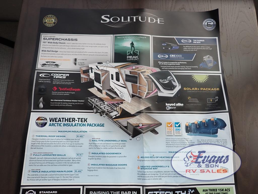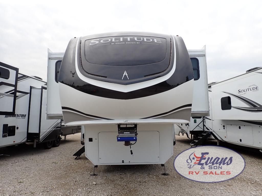 Each Solitude fifth wheel by Grand Design features a 101" wide-body construction, heavy duty 8,000 lb. axles, frameless tinted windows, and high-gloss gel coat sidewalls. You can camp year around thanks to the Weather-Tek Package that includes a 35K BTU high-capacity furnace, an all-in-one enclosed and heated utility center, and a fully enclosed underbelly with heated tanks and storage. Inside, you'll love the premium roller shades, hardwood cabinet doors, solid surface countertops, plus residential finishes throughout to make you truly feel at home. Each model also includes a MORryde CRE3000 suspension system, self adjusting brakes, and a MORryde pin box that will provide smooth towing from home to campground. Affordable luxury is possible with the Solitude fifth wheels; choose yours today!