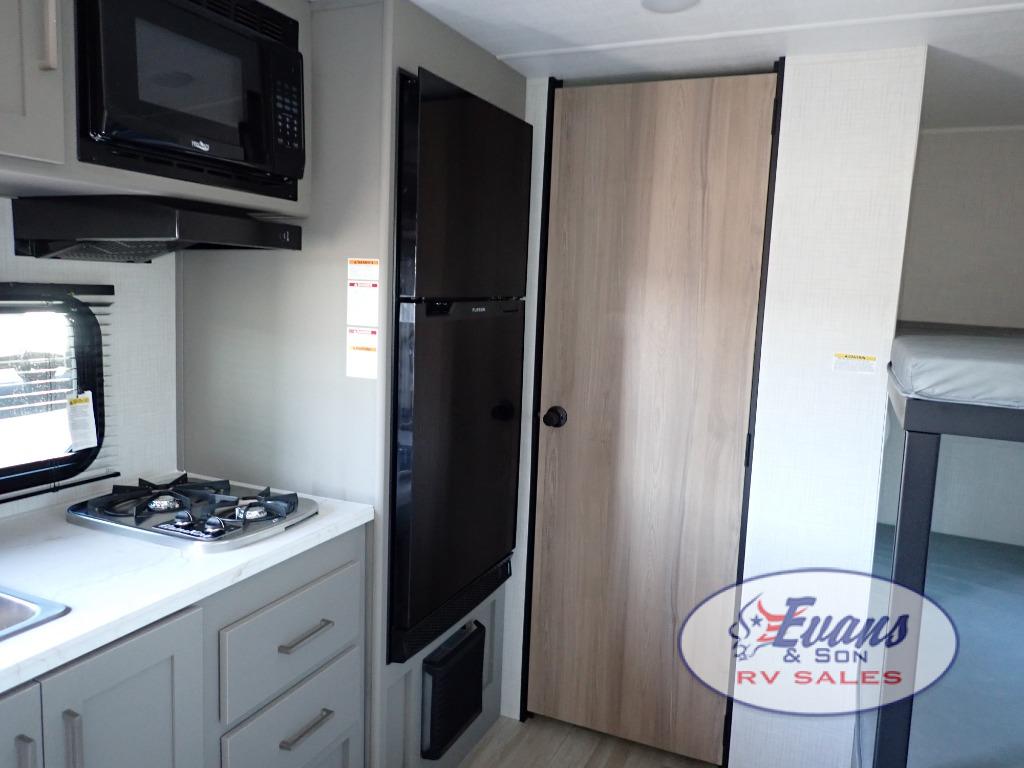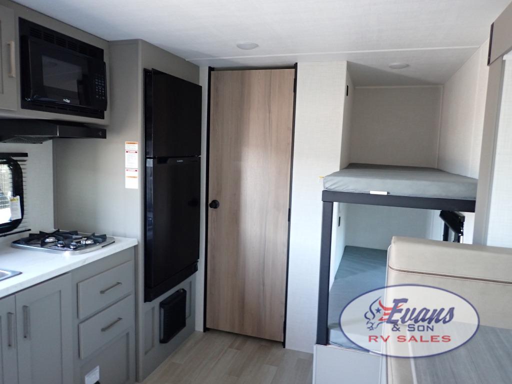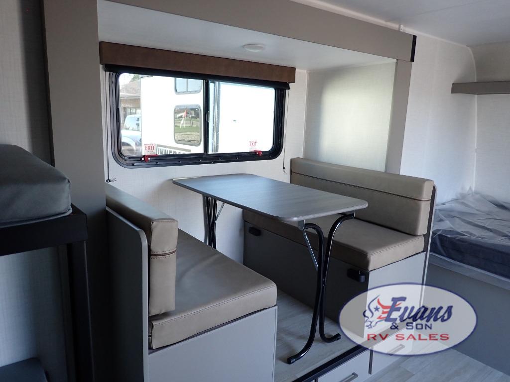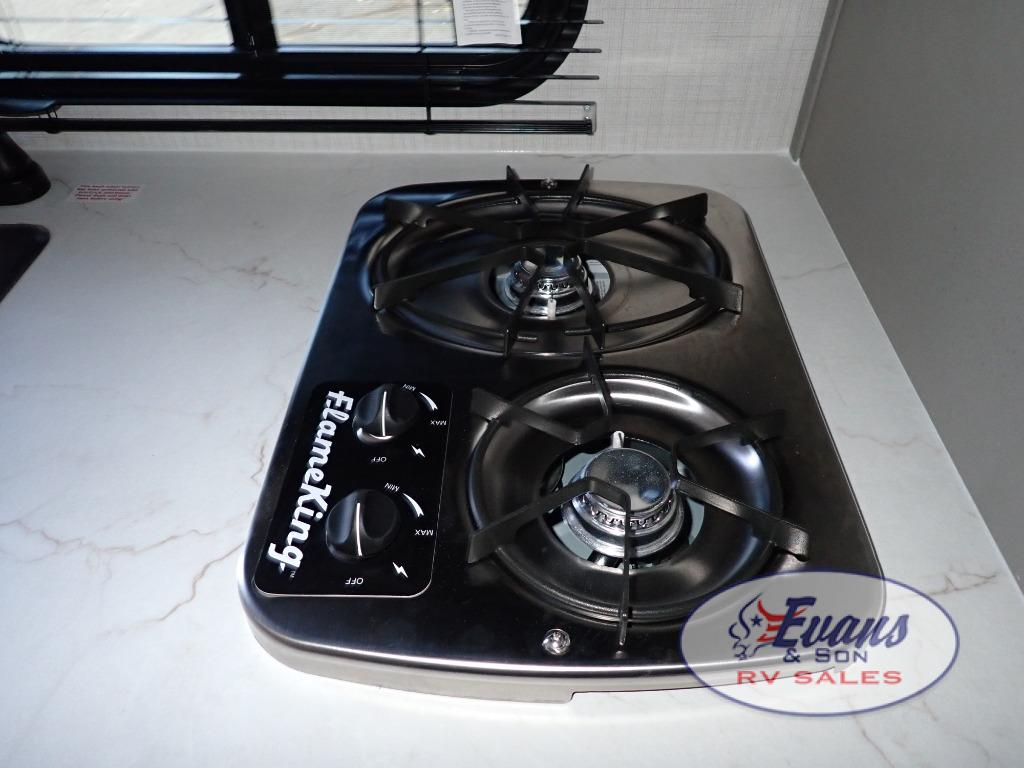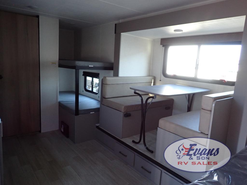 Step Inside this trailer where you can dine and relax on the slide out booth dinette which offers storage drawers below for your things. Everyone can take turns getting cleaned up in the full bathroom before falling asleep on the bunks, the queen-size bed or the booth dinette. The chef of your group will have a two burner cooktop to prepare meals and a 7.7 cu. ft. refrigerator for food storage. And the 10' power awning offers an outdoor living area protected from the elements once you add your camping chairs taken from the pass-through compartment.