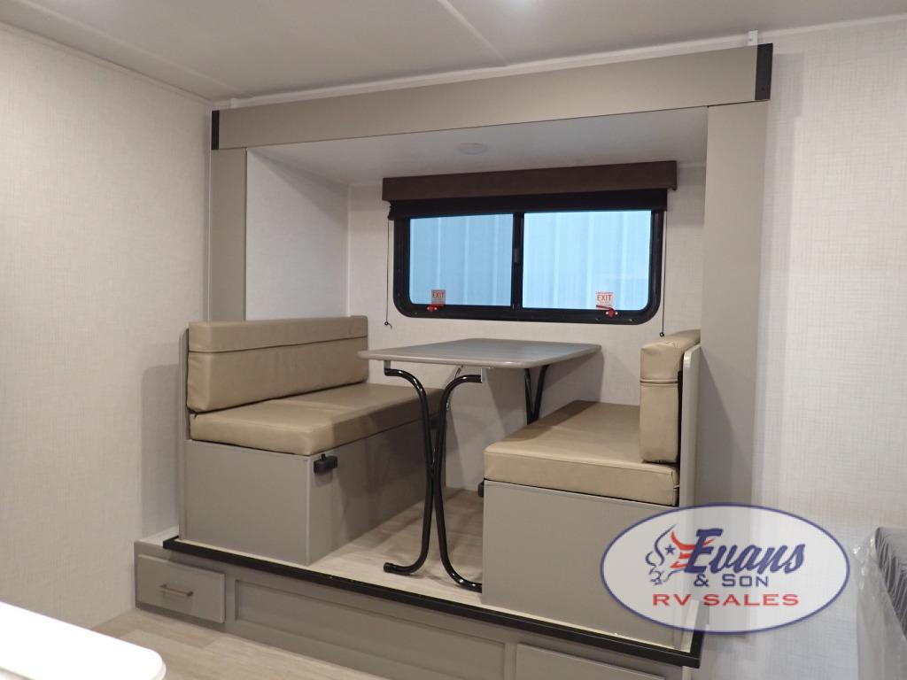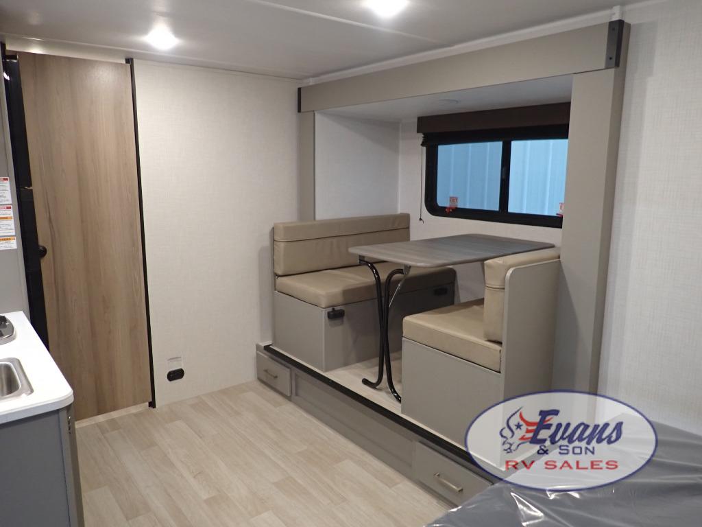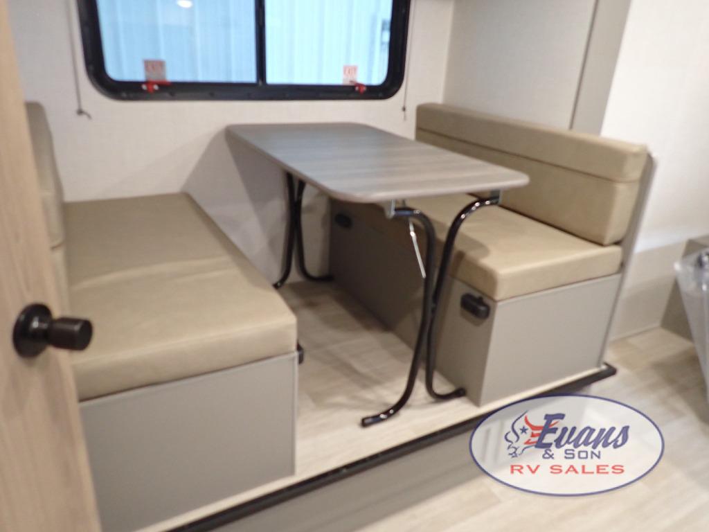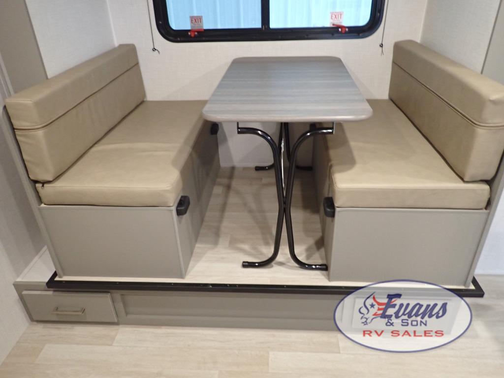 It's time to enjoy the great outdoors with family and friends at the campgrounds you like to meet everyone at! This trailer will allow three to four to camp comfortability with amenities such as a two burner cooktop, a 7.7 cu. ft. refrigerator, and a spacious rear full bathroom. The booth dinette slide offers a place to dine, read a book and even provides sleeping space and storage drawers for board games or throw blankets. The slide gives the interior more floor space as well. This model also includes a walk-around queen bed that will make your space feel a little more like home!