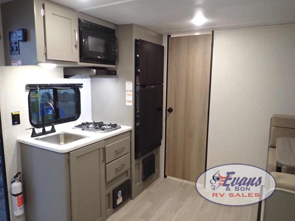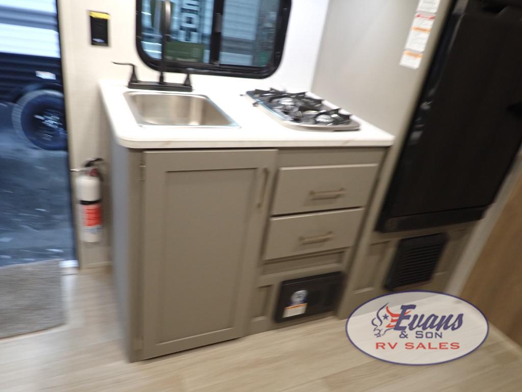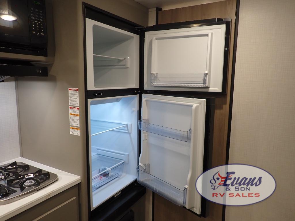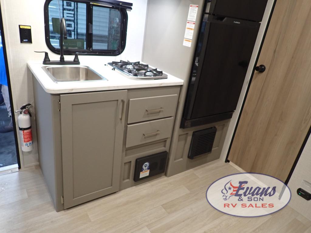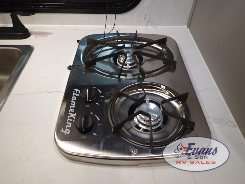 It's time to enjoy the great outdoors with family and friends at the campgrounds you like to meet everyone at! This trailer will allow three to four to camp comfortability with amenities such as a two burner cooktop, a 7.7 cu. ft. refrigerator, and a spacious rear full bathroom. The booth dinette slide offers a place to dine, read a book and even provides sleeping space and storage drawers for board games or throw blankets. The slide gives the interior more floor space as well. This model also includes a walk-around queen bed that will make your space feel a little more like home!
