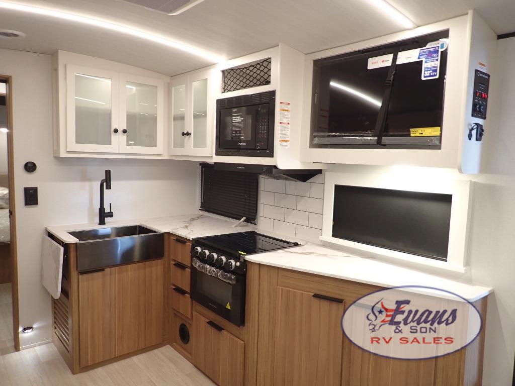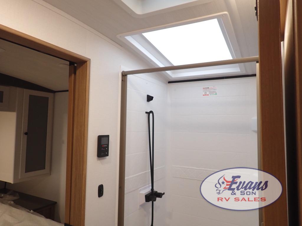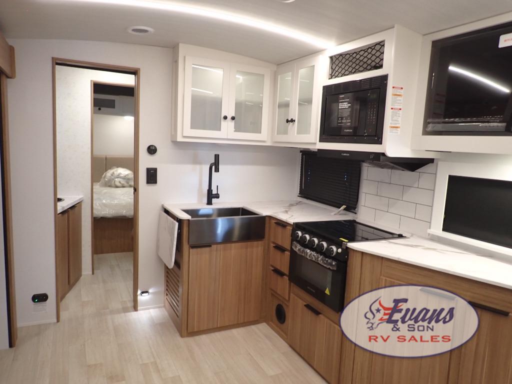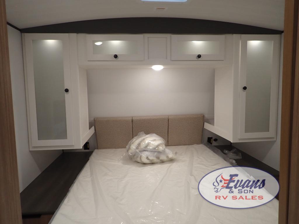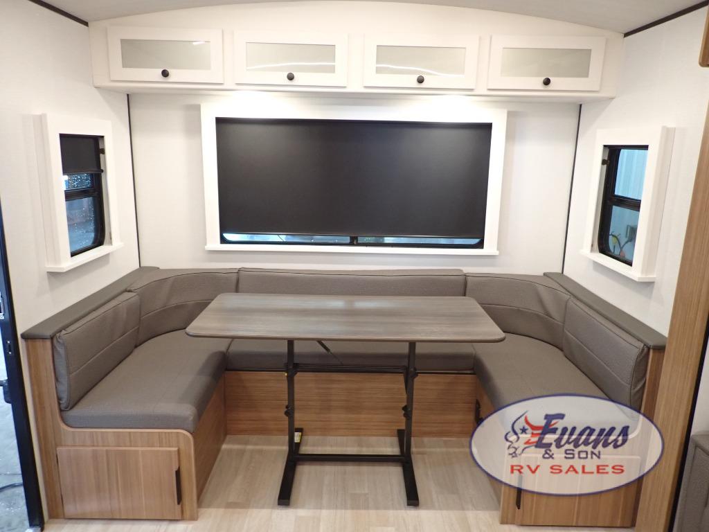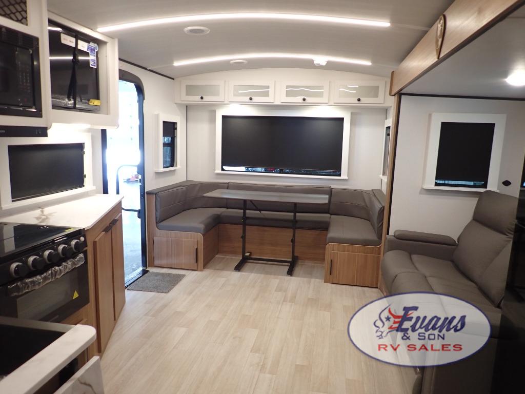 If you're looking to upgrade from a tent to a travel trailer, the time is now with this model! You will love having your own master bedroom up front with a queen bed, dual bedroom wardrobes and your own exterior entry door. The second entry door leads right into the combined kitchen and living area for added convenience. Your crew can dine or play a game around the U-shaped do-more dinette table or relax on the tri-fold sofa across from the entertainment center. These pieces of furniture will also double as your guests' sleeping space at night, and you have the option to choose luxury cinema recliners in place of the sofa if you don't need that much sleeping room. There is also a full walk-through bath to clean up in each day plus a fully-equipped kitchen to make meals!