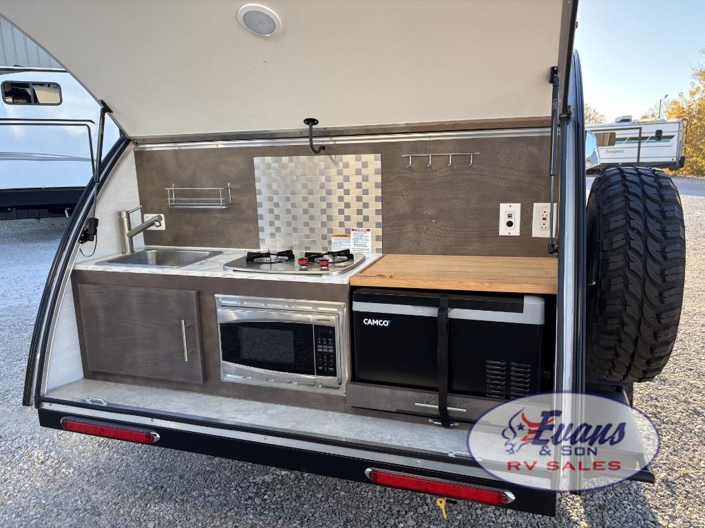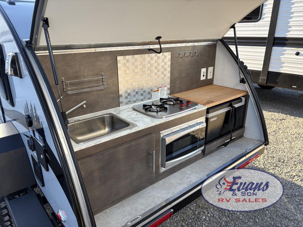 With any nuCamp RV TAG teardrop trailer, you can bring some of the comforts of home with you as you easily tow this lightweight trailer to the campgrounds. The outdoor kitchen includes a stainless steel sink and two-burner stove so you won't have to cook over a campfire each day. Inside, you'll find a composite floor, deluxe Amish cabinetry, sleeping accommodations, and a power roof fan to keep you comfortable. You will also appreciate the Convenience Package that comes with a 180-watt solar panel, a portable Bluetooth speaker, a 100 Ah 12-volt Lithium battery, and more!